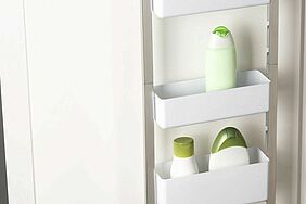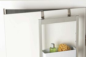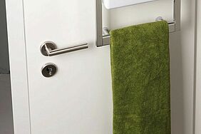 Von Augencreme bis zur Zahnbürste findet alles in den drei Kästen des extra für das Bad entwickelten Tür-Regals Platz. Zusätzlich ist ein Handtuchhalter von der aus dem niedersächsischen Dannenberg stammenden Rieke Maasch in ihrem Konzept bedacht worden. In diesem Konzept hatte sie Formholz mit verchromtem Metall kombiniert, praktische Handhabungen einbezogen und außerdem an ein einfaches Aufhängen statt Bohren des Badezimmermöbels gedacht.