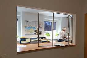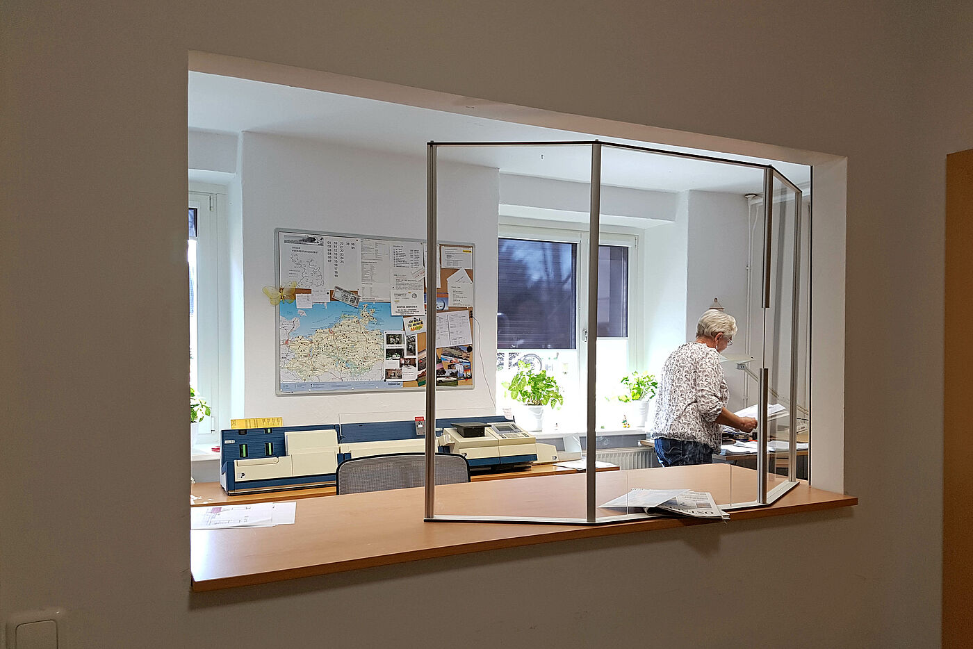 Ein Prototyp der „Spritzschutzeinrichtungen“ befindet sich seit dem 6. April 2020 im Krisenstabsbüro im Probebetrieb. In der Poststelle kommt eine solche Einrichtung bereits seit Gründonnerstag zum Einsatz.