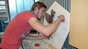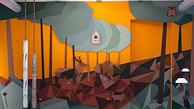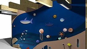 Wahrnehmen und Begreifen durch aktives Erkunden Die einzelnen Objekte sind direkt auf der Wand angebracht und fügen sich zu einer Wald- und einer Wasserszene zusammen. Eine hölzerne Eule sitzt beispielsweise in dem orange, grün und braun gehaltenen Wald und ihre Flügel können zum Schlagen bewegt werden. Ein Specht wird nach dem Ziehen an einer Schnur hörbar. Beim Öffnen der Schatztruhe in der blau dominierten Wasserwelt fangen Lichter an zu leuchten. Wahrnehmen und Begreifen durch aktives Erkunden standen im Mittelpunkt der Aufgabenstellung. Neben dem haptischen sollten auch der akustische und optische Sinn angesprochen werden. Ganz unterschiedliche Materialien und Leuchtelemente wurden dafür ausgesucht, weiche, glatte und raue Oberflächen verarbeitet.