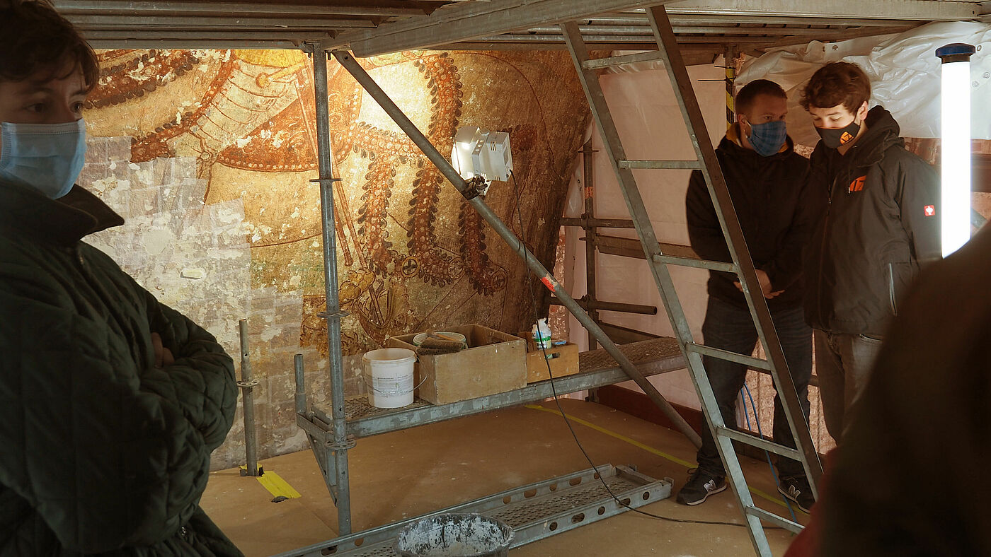 Hoch hinauf bis zu den Arkaden der Wismarer St. Georgenkirche ging es für die Studierenden im fakultätsübergreifenden Seminar "Historische Baukonstruktionen". Ziel des Aufstiegs war die Besichtigung des temporären Arbeitszimmers eines Restaurators, der dort oben Arbeiten zur Sicherung historischer Malereien ausführt. Aufgrund der Zerstörung des Kirchendaches im II. Weltkrieg und die infolgedessen eindringende Feuchtigkeit sind die Wandmalereien stark beschädigt und sollen nun vor dem Verfall bewahrt werden. Unsere Studierenden erhalten durch solche Lehrveranstaltungen vor Ort, die fester Bestandteil der Lehre von Prof. Dr.-Ing. Frank Braun sind, Einblicke in die Arbeit von Fachkolleg_innen, mit denen sie später in einem interdisziplinären Team zusammenarbeiten können.