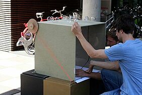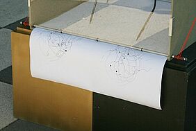Simon Andert (27 Jahre) und Martin Leithner (30 Jahre), Master-Studenten aus Wien, stellten ein windgesteuertes Schreibgerät vor. Einen in etwa 60 x 60 x 60 cm großer Kasten mit vier Windschaufeln auf der Oberseite, zur Steuerung der an Gummischnüren befestigten, innen liegenden Stifte, und jeweils einer größeren Windschaufel an den Seiten rechts und links, zum windgesteuerten Durchlauf der Papierbahn, entwickelten sie. Größtenteils wurde das Schreibgerät per CAD-Technik (Computer Aided Design) beziehungsweise CAM-Technik (Computer Aided Manufacturing) erstellt. Die Windkraft wird auf der durchlaufenden Papierbahn mit schwarzer Farbe in 2D-Optik visualisiert. Durch ein Sichtfenster können die vier tanzenden Stifte beobachtet werden. Immer dann, wenn sie einen dickeren Punkt zeichnen, ist es gerade windstill und die Bewegungen stoppen, der Stift liegt auf dem Papier auf und das Papier saugt die Farbe auf. Bisher ist es noch ein „no name“-Projekt, so die Studenten, an dem sie weiter arbeiten wollen. Auch die Professoren aus Wien haben noch Pläne mit den Entwürfen ihrer Studenten, so zum Beispiel die Präsentation auf der Vienna Design Week im September 2012.