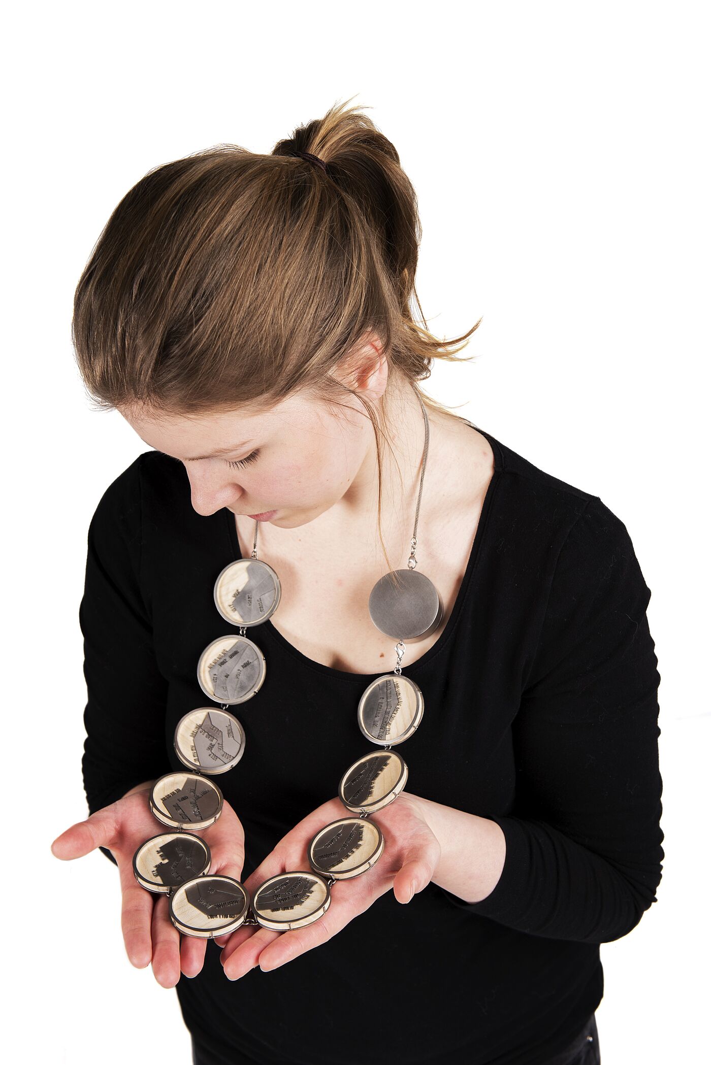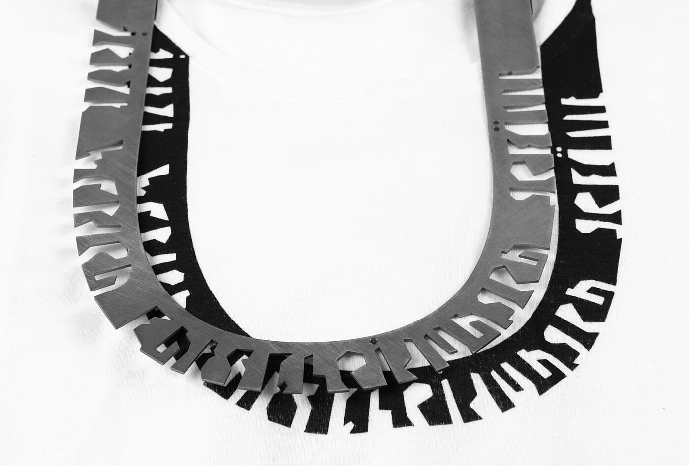 "Entscheidungen fällen ist nicht leicht", singt Balbina zusammen mit dem Künstler Maeckes in ihrem Titel „Tisch“. Die im Text verwendete Metapher der Motorsäge, mit der im Wald Entscheidungen gefällt werden, war der Schlüssel zum Entwurf für einen Halsschmuck von Nele Bielenberg. „Jetzt werden Entscheidungen gefällt“ ist auch der Titel der Ausstellung, die neueste Ergebnisse einer erfolgreichen Zusammenarbeit von Schmuck- und Kommunikationsdesignern zeigt. Im Vordergrund steht die Arbeit mit Schrift, die Studierenden arbeiteten zu Songtexten von Balbina, Dota, AnnenMayKantereit und V-Mann AKA Hiob. Entstanden sind Schmuckstücke, kalligrafisch-typografische Plakate, Objekte und ein Trickfilm.