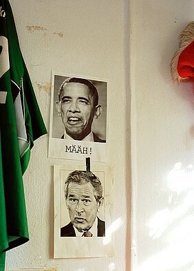 Florian Anhorn, hat über einen längeren Zeitraum die Atmosphäre in einem „Proberaum“ interpretiert. In dichten Ausschnitten zeigt er dennoch Räume, die es an Weite nicht mangeln lassen. Seine Kompositionen entsprechen denen der Kultur in Malerei und Bildender Kunst. So berichten seine Bildtafeln von der Beziehung zweier amerikanischer Präsidenten, Busch Junior und Obama, zwischen roten und grünen Textilien.