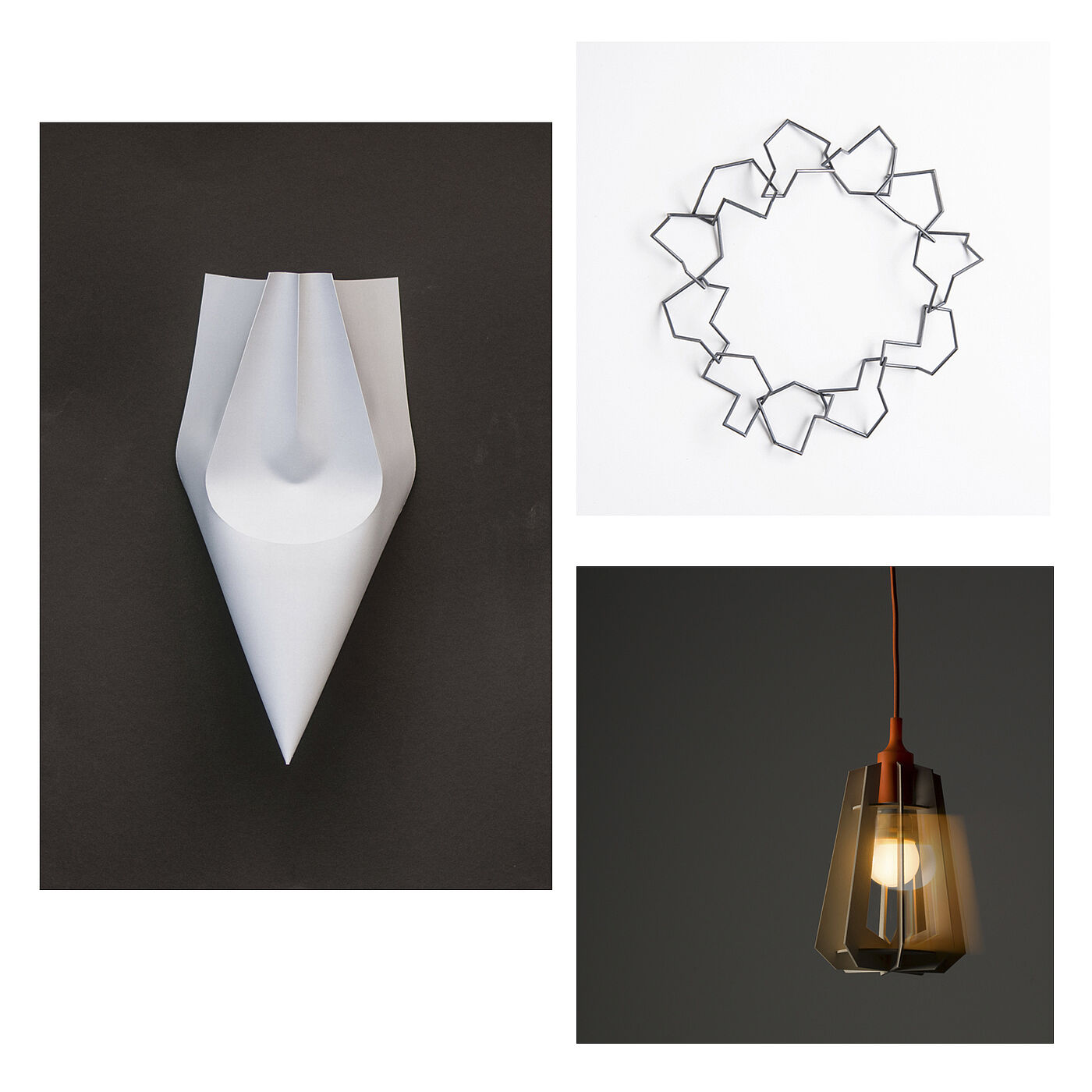 Dieses Jahr zeigen wir auf der blickfang in Hamburg u. a.: Eine Maske von Julia Neumann (Produktdesign), einen Leuchtenentwurf von Jacobo Wolf (Produktdesign) und einen Halskettenentwurf von Maria Konschake (Schmuckdesign).