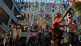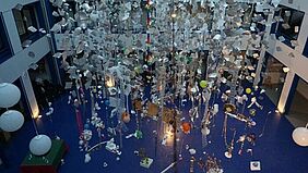 Das Besondere daran: Im 14 Meter hohen Atrium kann ein winterlich anmutender Fantasiegarten bestaunt werden. Die außergewöhnlichen und glitzernden Objekte, wurden gemeinsam von den Schülerinnen und Schülern der Grundschule mit Wismarer Innenarchitektur-Studierenden entwickelt und umgesetzt. Das Entwurfsprojekt beschäftigt sich mit dem Grundschulumbau aus Anlass der Inklusion und rückt beispielhaft die Grabower Grundschule in den Fokus.