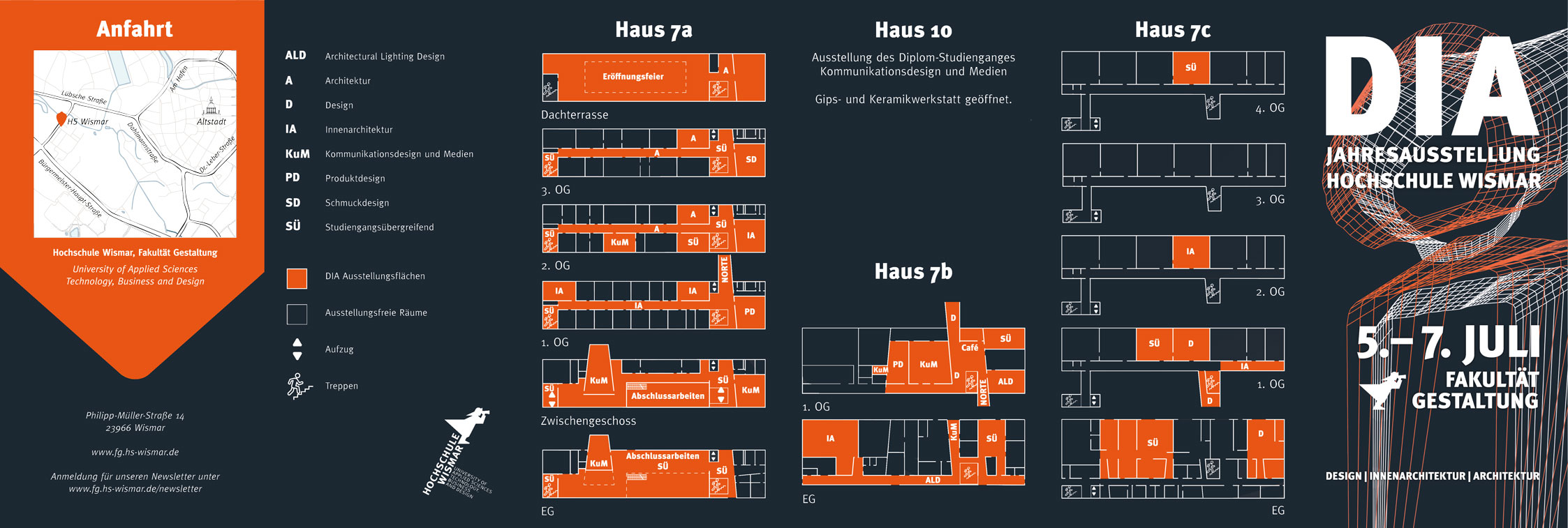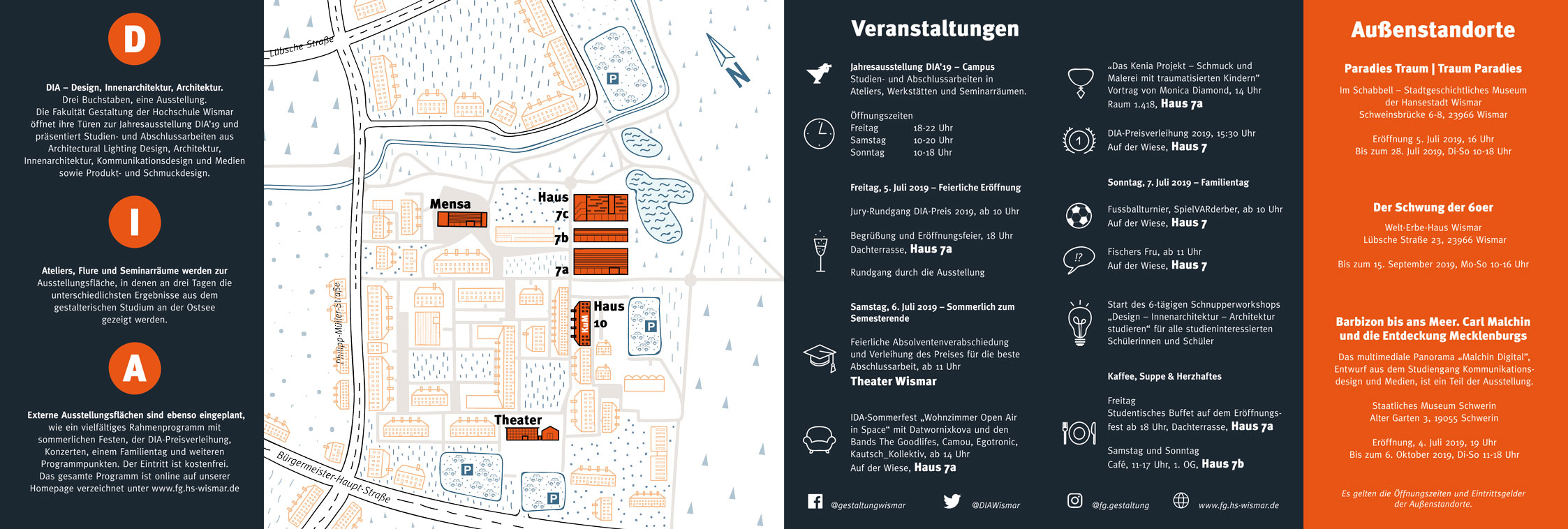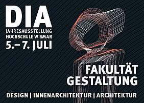 Von Freitag, dem 5. Juli bis Sonntag, dem 7. Juli 2019 öffnet die Fakultät Gestaltung der Hochschule Wismar ihre Türen zur Jahresausstellung DIA und präsentiert Studien- und Abschlussarbeiten aus Architectural Lighting Design, Architektur, Innenarchitektur, Kommunikationsdesign und Medien sowie Produkt- und Schmuckdesign. Ateliers, Flure und Seminarräume der Fakultät Gestaltung werden zur Ausstellungsfläche in denen an drei Tagen die unterschiedlichsten Ergebnisse aus dem gestalterischen Studium an der Ostsee gezeigt werden. Externe Ausstellungsflächen sind ebenso mit eingeplant, wie ein vielfältiges Rahmenprogramm mit Festen, DIA-Preisverleihung, Jury-Rundgang und weiteren Programmpunkten. Der Eintritt ist kostenfrei. Die Anfangsbuchstaben der Studiengänge Design, Innenarchitektur und Architektur formieren sich zum Titel DIA, der seit 2006 stattfindenden Jahresausstellung in Wismar.