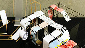 Eine aus Holz entwickelte Konstruktion bildet zusammen mit Papierbahnen aus Präsentationsplänen und Zeichnungen abgeschlossener Projekte von Studierenden der Fakultät Gestaltung der Hochschule Wismar das Grundgerüst des Messestandes auf der internationalen Fachmesse „imm cologne 2020".