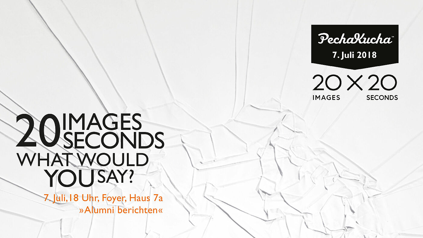 Bereits zum 5. Mal finden die Pecha Kucha-Vorträge im Rahmen der Jahresausstellung DIA statt. Unter dem Motto „Absolventen berichten“, haben Alumni die Möglichkeit Einblicke in ihren Arbeitsalltag zu geben und so die Zuhörer an ihrem Weg vom Studium ins Berufsleben teilhaben zu lassen.