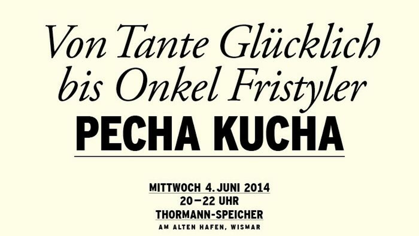 Am Mittwoch, dem 04. Juni 2014 um 20 Uhr lädt die Fakultät Gestaltung der Hochschule Wismar zu Kurzvorträgen im japanischen Format „PechaKucha“ im Rahmen ihrer aktuellen Ausstellung „Je t’aime MV – Impulse für das Land Mecklenburg-Vorpommern“ in den Thormann-Speicher am Alten Hafen in Wismar ein. Rund zehn Mecklenburger sollen anhand von 20 Bildern genau 6:40 Minuten zu Wort kommen. Aus Wismar haben unter anderem Vertreter vom Cafe Glücklich, dem Friseursalon Fristyler, dem Förderverein „Poeler Kogge“ e.V. und dem Filmbüro MV ihre Beteiligung zu gesagt. Aus der Region sprechen außerdem Holger Stark aus der Rostocker Galerie Wolkenbank, Birgit und Horst Lohmeyer vom Forsthof Jamel, der Bürgermeister Hans Kreher aus Bad Kleinen sowie Udo Rathke vom Mecklenburgerischen Künstlerhaus Schloss Plüschow. Alle Interessierten sind herzlich willkommen. Der Einritt ist frei.