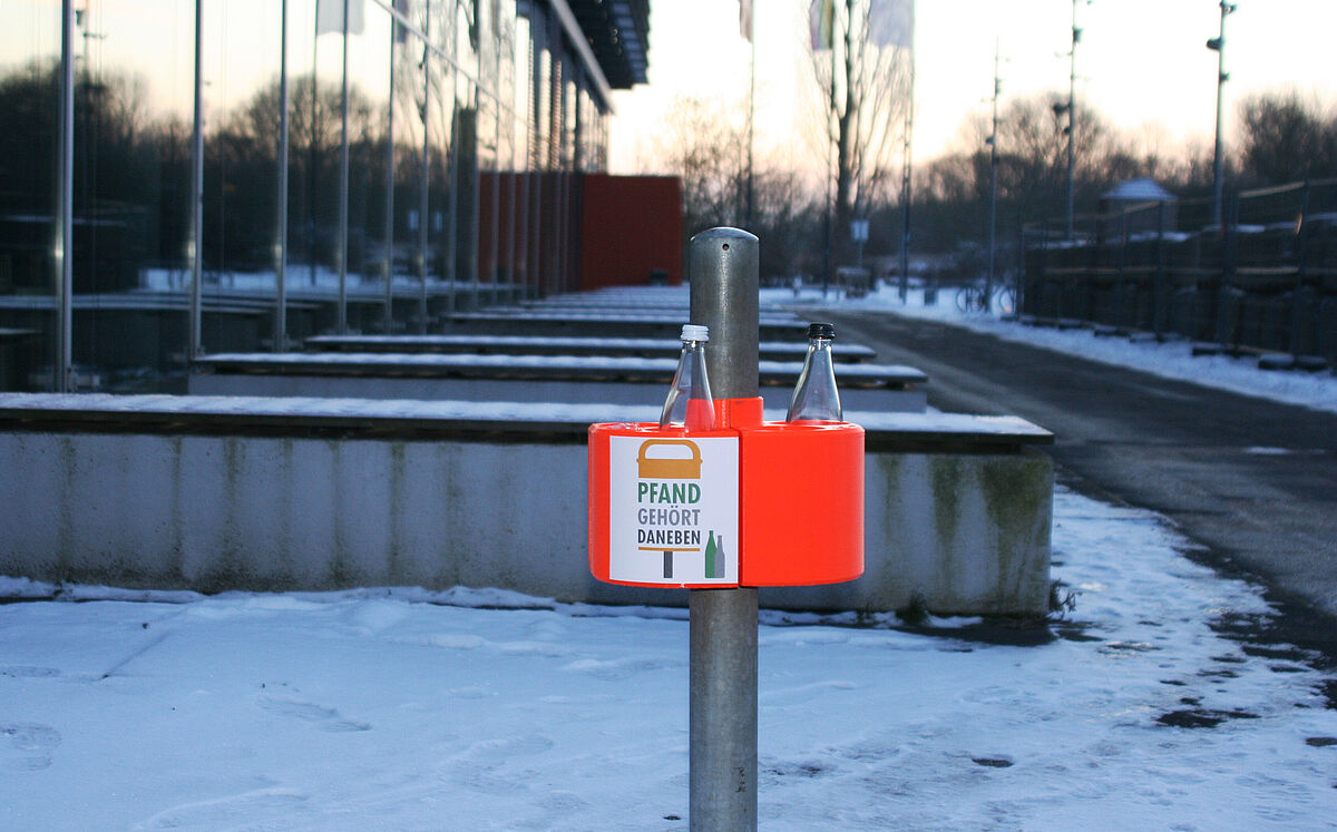 Unsere früheren, mülleimergebundenen Prototypen aus Metallblech, sind leider im Lauf der Zeit verschwunden. Zeit für eine Neuauflage: Der neue Pfandhalter wird aus UV-beständigem PLA gedruckt, leuchtet in Neonorange und ist kaum zu übersehen. Er lädt dazu ein, Pfandgut abzustellen und unkompliziert mitzunehmen. Befestigt ist der Pfandhalter nun an einem Poller. So bleibt er gut sichtbar, ohne beim Entleeren der Mülleimer zu stören.