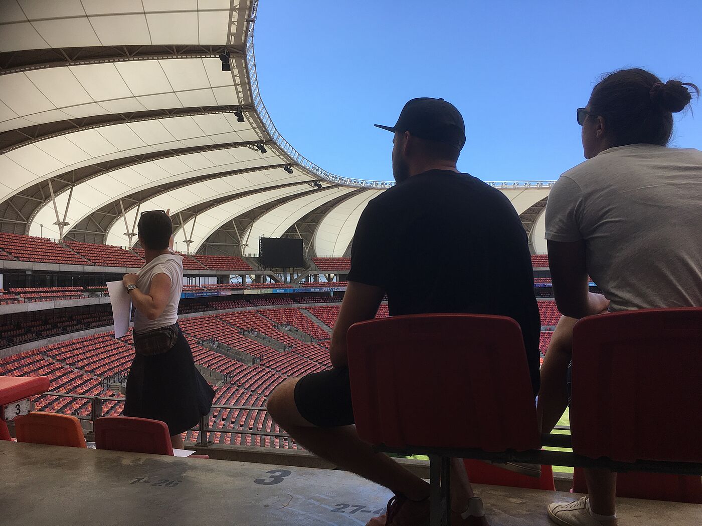 After the last foundation was poured, the last pole for the day was planed and the not-even-close-to-last hole of the metal frames was drilled, we called it a day. The next day would offer a chance to sleep-in and relax in the morning. The long expected visit of the Nelson Mandela Bay Stadium was finally due. As Silke (Prof. Flassnoecker) was part of the team that designed and realised the stadium before the World Cup, the tour was not of the standard type. The focus was set on the structure, the geometry and the building process. And a bit of complaining over FIFA.