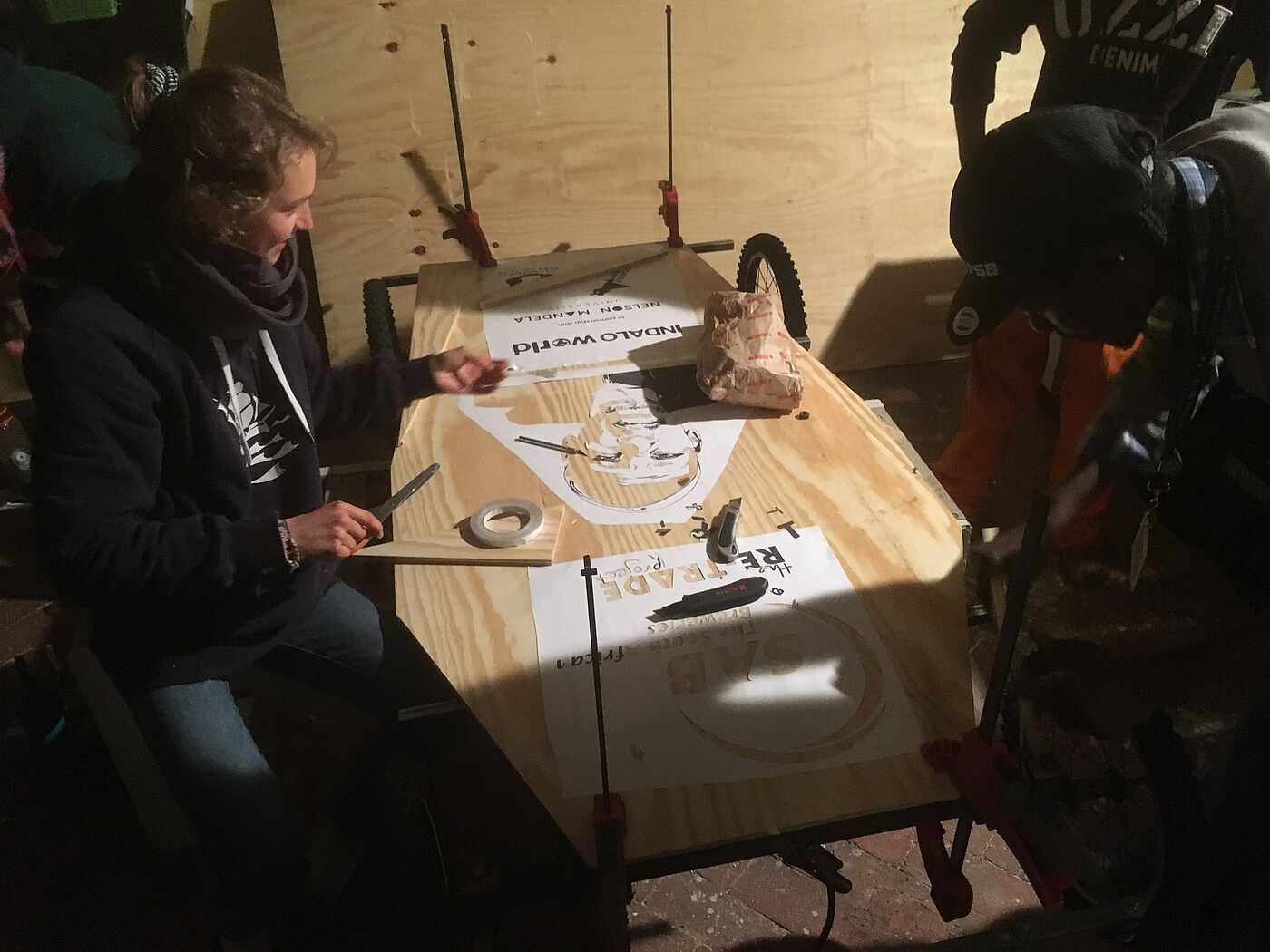 With final drawings and huge motivation we started into the Monday. Hours later the cart still did not look like the drawing. The motivation from the morning was gone especially after we got the message that we could not laser cut the branding. But giving up was no option. So instead of a nice, easy laser cut we got prints, sticked them onto the board of the cart and then cut it. And cut it… And cut it… .. . In between we had a quick sandwich lunch/dinner and then we cut again while the others worked around us attaching the wheels and marking the spots for the screws.