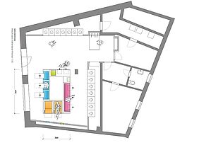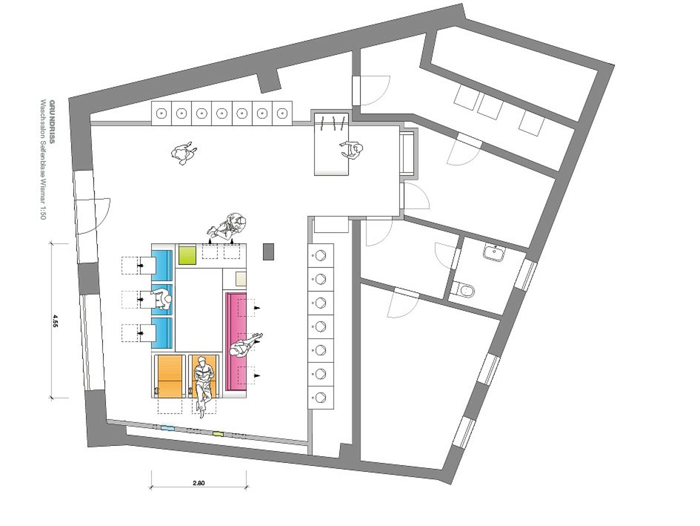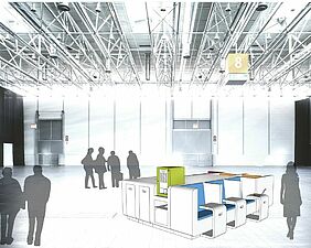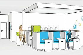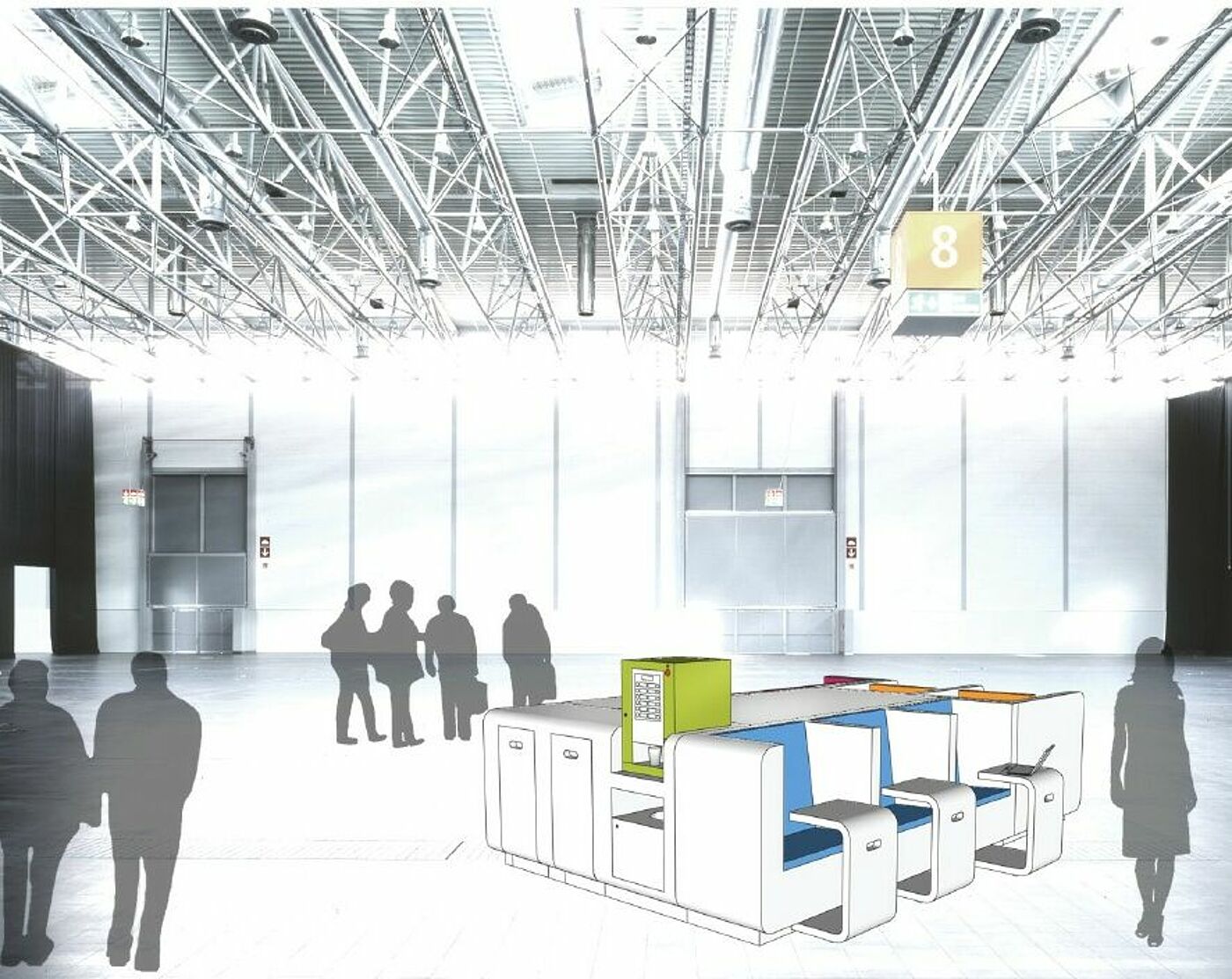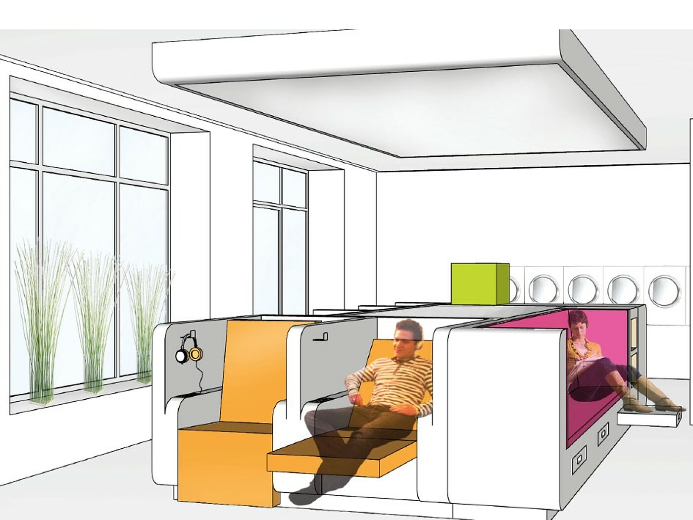 4waiting kombiniert all diese unterschiedlichen Anforderungen und Bedürfnisse. Die Idee dazu entstand ursprünglich im Waschsalon. Während des Waschgangs zuhause können wir es uns im Wohnzimmer mit einem Buch gemütlich machen, in der Küche Kaffee kochen oder Zeitung lesen. Wir können an unseren Rechnern arbeiten oder uns eine Runde ausruhen. Wie können diese wohnlichen Bereiche in den öffentlichen Raum transportiert werden? Entstanden ist ein blockförmiges Möbel, an dessen vier Seiten unterschiedliche Bereiche angeordnet sind. Durch eingelassene Sitzgelegenheiten, entstehen bequeme Nischen als Rückzugsmöglichkeit.