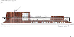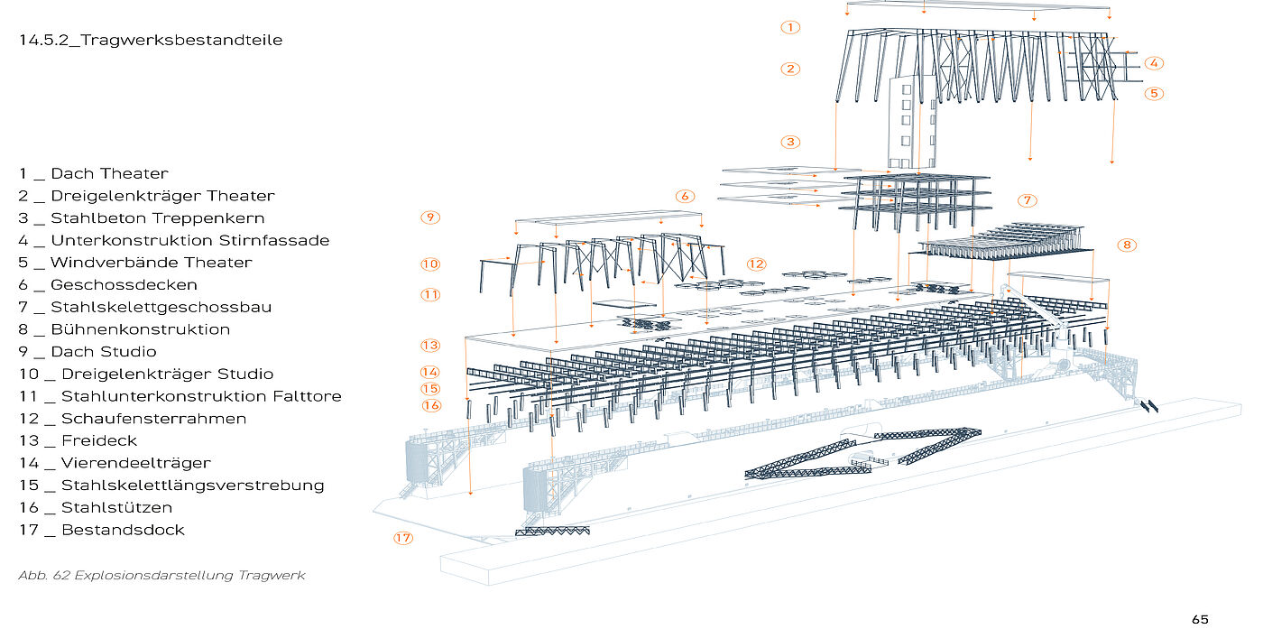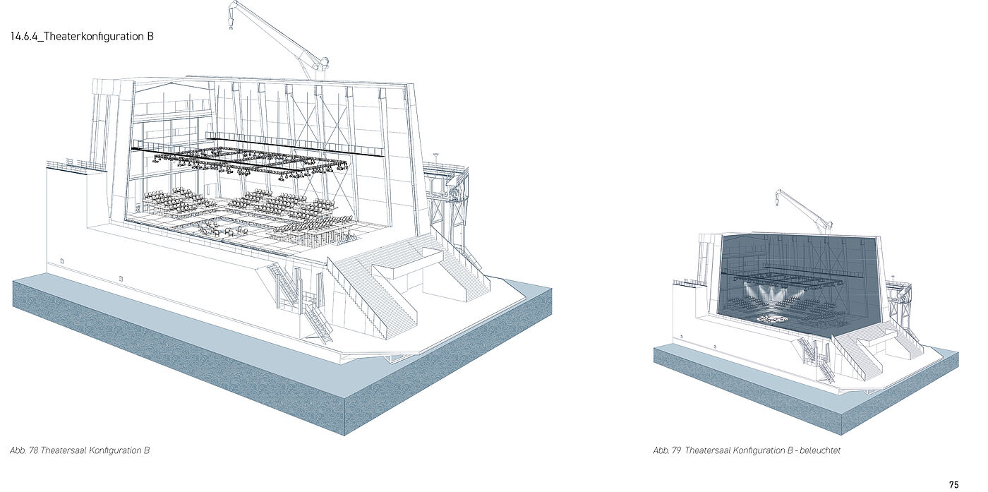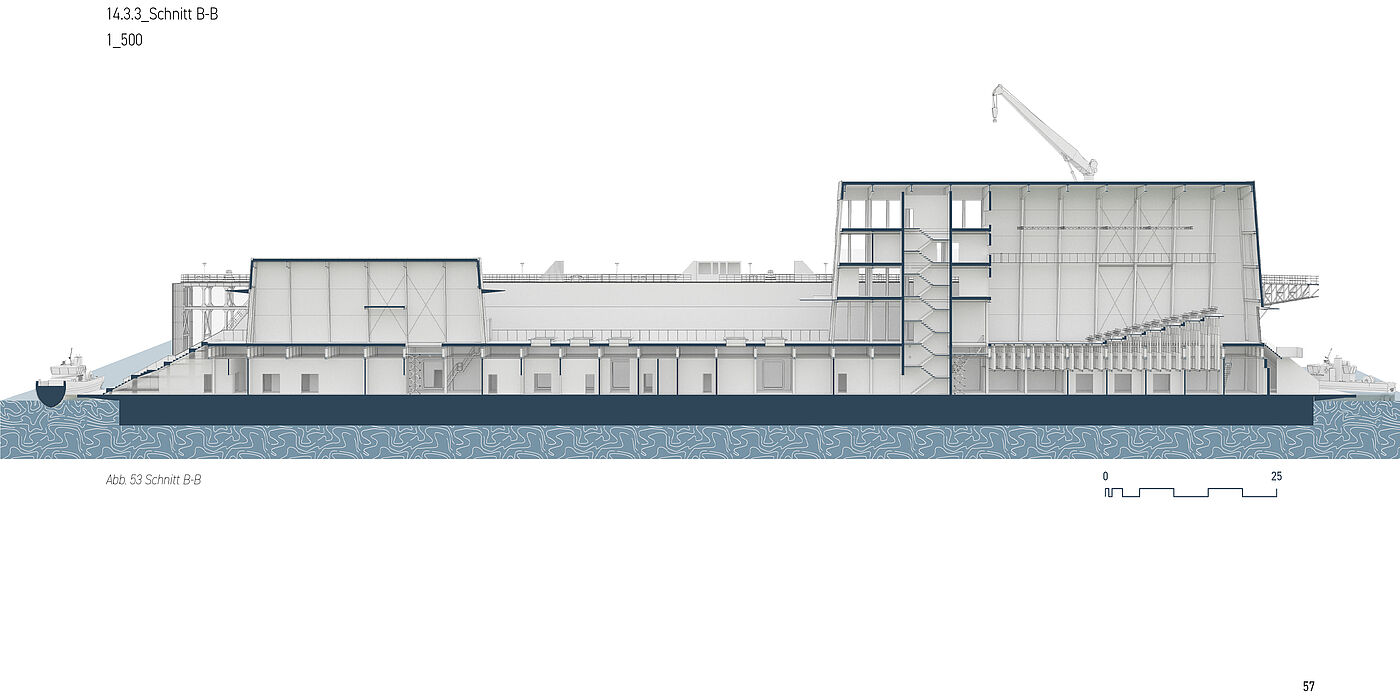 Der neu geschaffene Theatersaal lässt durch seine Flexibilität viele moderne Inszenierungsvorstellungen zu und ist dazu eine schöne Ergänzung zu den traditionellen Guckkastenbühnen. Das Dock B bietet mit seinem Bestand eine robuste Basis, die durch ihren Bauraum viel Freiraum für den Entwurf lässt. Allerdings lässt das Dock B nur an Bug und Heck eine Verbindung mit dem Wasser und der Umgebung zu. Die beiden massiven Ballasttanks auf der Backbord- und Steuerbordseite nehmen dem Gast viel Sicht. Dies wäre ein Punkt, der in zukünftigen Ausführungen zu überdenken wäre. Hier wäre es durchaus denkbar, weitere ergänzende Veränderungen am Bestand vorzunehmen, als es beim floating theater in diesem Entwurf getan wurde. Das Tragwerk könnte während einer weiterführenden Bearbeitung optimiert werden, um es noch effizienter und leichter zu gestalten. Das Dock B ist mit dem Entwurf schwimmfähig und seetauglich. Schlussendlich stellt es mit dem floating theater eine Pilotlösung dar, die sowohl in ihren einzelnen Aspekten, als auch in ihrer Kombination eine Vorreiterrolle einnimmt. Es zeigt, wie in Zukunft mit Gebäuden an der Küste und bedrohten Gebieten umgegangen werden kann. Sollte sich die Welt weiterhin ohne merkliche Veränderungen in der Klimapolitik und im menschlichen Verhalten entwickeln, ist es vielleicht die Zukunft der Architektur und der Städte schwimmend entworfen zu werden.