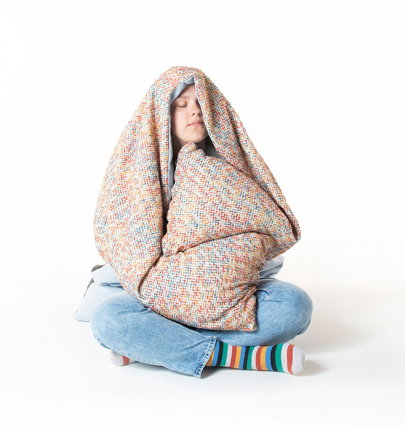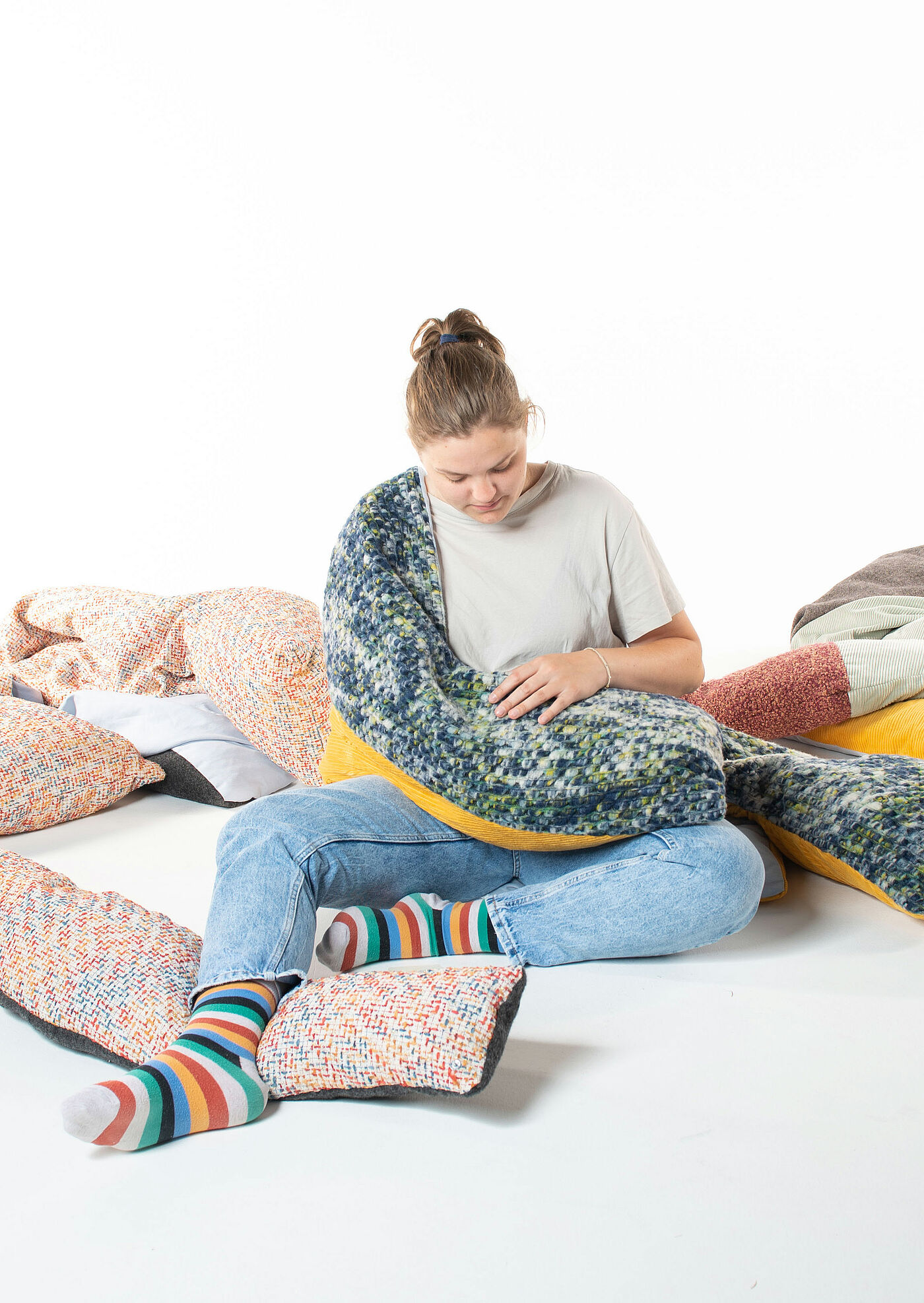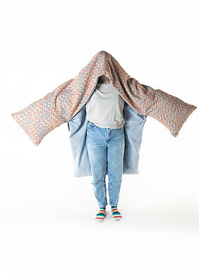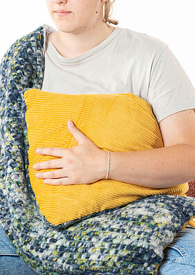 Der finale Entwurf des HAMI´s vereint ein Nähebedürfnis sowie das Bedürfnis danach, sich zu entspannen. Das Kissen kann auf unterschiedliche Art und Weise genutzt werden. Von der leichten Umarmung der Kissenarme um den Torso bis hin zur völligen Einnahme des Oberkörpers durch das Aufsetzen der Kapuze. Das Objekt kann im Sitzen sowie im Liegen in unterschiedlichen Positionen genutzt werden. Das Ziel ist, dass sich die Nutzer*in entspannt und das Gefühl einer Umarmung bekommt, somit also das Empfinden nicht mehr allein zu sein oder sich selbst Aufmerksamkeit zu schenken hat. In unserer Gesellschaft nimmt Körperkontakt keinen besonders hohen Stellenwert ein. In anderen Kulturen wird sich viel mehr umarmt, es werden Küsschen gegeben und die Menschen kommen sich näher. In Zeiten von Covid-19 jedoch ist die ohnehin schon vorhandene Distanz zwischen den Menschen in westlichen Kulturkreisen noch intensiver geworden. Daher ist dieses Kissen nicht nur für jene, die sich selbst verletzen, sondern für alle Menschen, die ein Bedürfnis nach Nähe verspüren, welches nicht gestillt werden kann.
