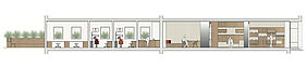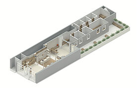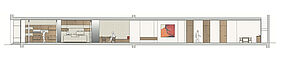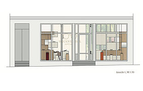 Dieser Blickwechsel wird durch ein Modul innerhalb des Raumes aufgegriffen, dass verschiedene Funktionen übernimmt: es ist die Präsentationsfläche für Brillen, sorgt für Stauraum, bietet Beratungs-, Ablage oder Sitzflächen und integriert Spiegel. Demnach übernimmt das Modul alle wesentlichen Nutzungen im Raum und ist zum sitzen, stehen oder schreiben geeignet.