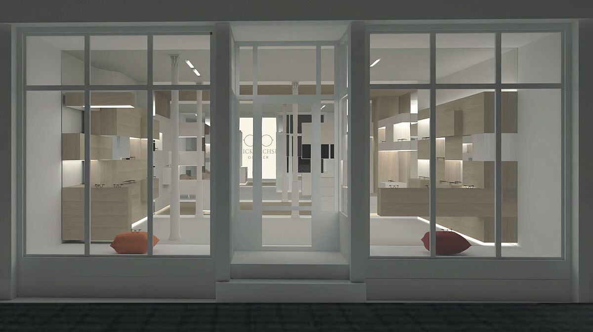 Besonders bei dem Modulsystem sind die Vor- und Rücksprünge, die den Blick gezielt auf die Brillen lenken sollen. Durch diese können die Brillen durch indirekte Beleuchtung in den Vordergrund gestellt werden. Es gliedert den Raum und schafft Flächen für direkte Inszenierung der Brillen. Der Raum ist durch einen Materialwechsel in drei klare Zonen gegliedert: den Ausstellungsraum, den Verkaufsraum und den Beratungsbereich. Durch die Materialien, die sich über Wand, Boden und Decke ziehen entsteht ein Blickwechsel und ein verschiedenes Raumgefühl des Betrachters beim Durchlaufen des Raumes. Der Raum zeigt sich demnach nicht nur zur Ausstellung der Brillen, sondern widmet sich auch gestalterisch dem Sehen und Erleben des Raumes.