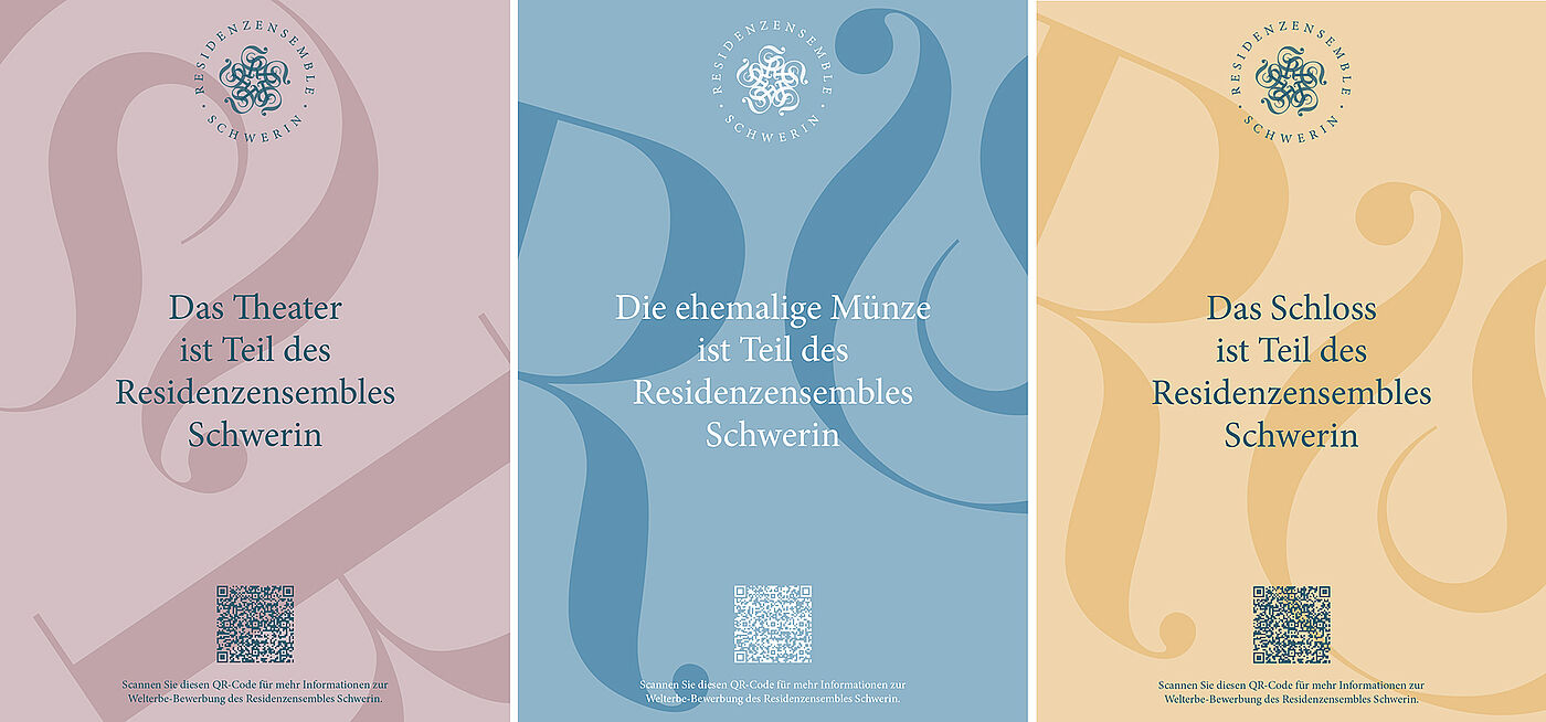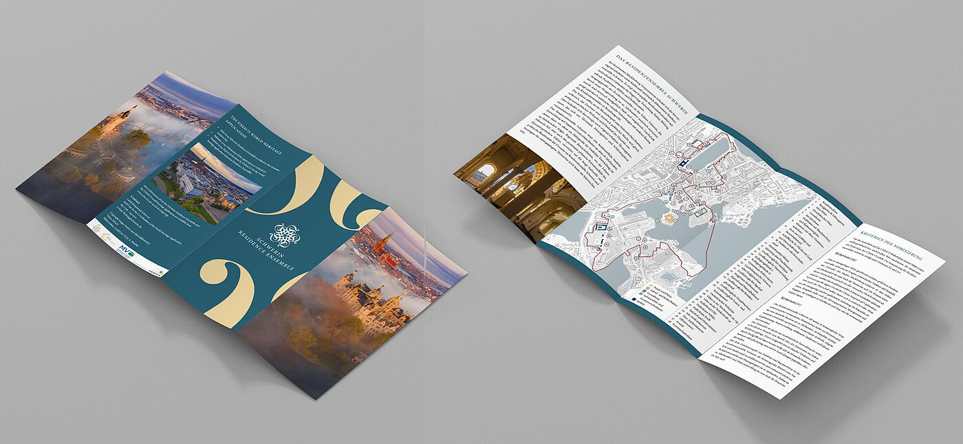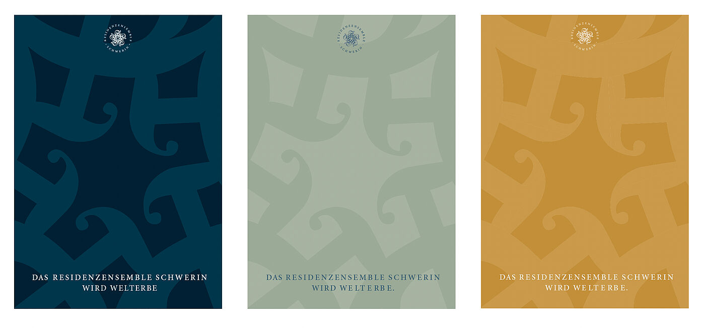 Die typografische Gestaltung des Corporate Designs des Residenzensembles Schwerin ist bestimmt durch eine klassische Art des Umgangs mit Schrift. Initialen, Kapitälchen, französische Anführungszeichen und Mediävalziffern sind fester Bestandteil.