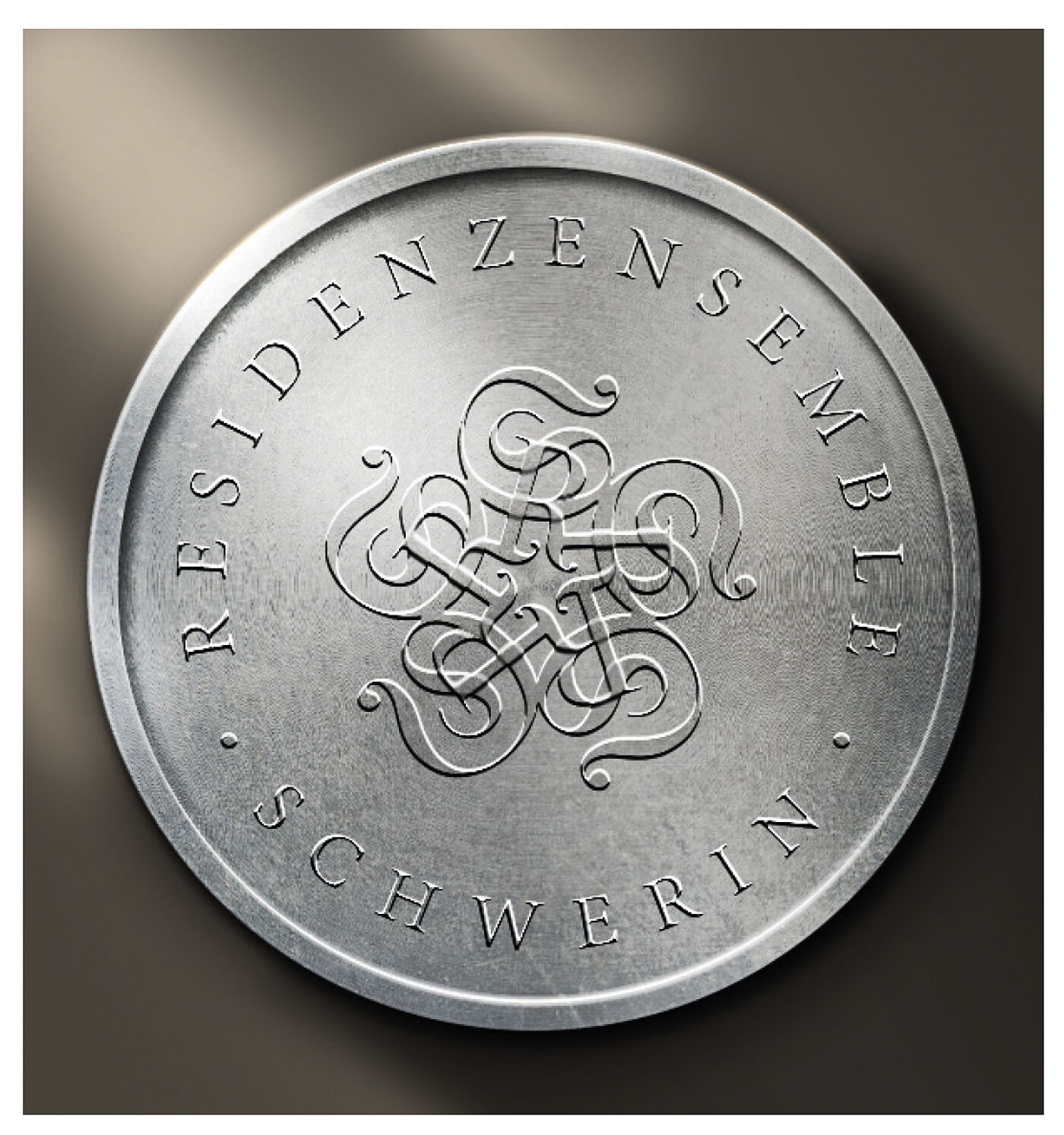 Ursprung der Inspiration für den Logoentwurf der „Blüte“ waren die zahlreichen Ornamente, die an vielen Gebäuden des Residenzensembles zu finden sind. Sie zieren z.B. Decken, Wände, Fenster und Türen und sind damit ein elementares Gestaltungselement des Ensembles. Ein neues, eigenständiges Ornament für das Residenzensemble wird nun Bildmarke. Die Wortmarke „Residenzensemble Schwerin“ wird hier auf ihre beiden Anfangsbuchstaben R und S reduziert, um aus diesen beiden Buchstaben ein neues Zeichen zu kreieren. Dabei wurden die Initialen „S“ der Walbaum-Fraktur und die Initiale „R“ der klassizistischen Bodoni miteinander verwoben. Die Fraktur von Justus Erich Walbaum aus dem beginnenden 19. Jh. gilt als ausgewogene klassische deutsche Fraktur. Die Bodoni-Antiqua vom italienischen Schriftentwerfer und Typografen Giambatista Bodoni in den klassischen Proportionen gilt als „Stilikone“ und verkörpert Modernität und Zeitlosigkeit.