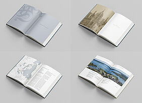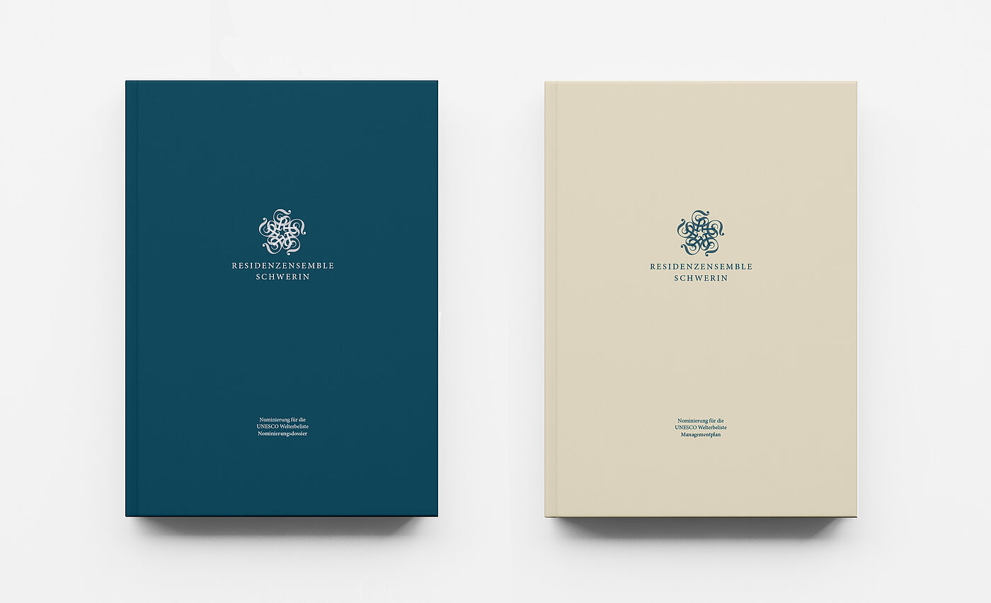 Nominierungsdossier und Managementplan für den Welterbeantrag vereint alle bisher genannten gestalterischen Elemente. Den Bucheinband des Dossiers schmückt die weiße Logo- Variante auf dem edlen, blauen Hintergrund. Der Managementplan erhält einen cremefarbenen Einband mit dem Logo in dem gewissen Blau. Ein eigens gestaltetes Vorsatzpapier rapportiert die Bildmarke zu einem Stoffmuster. Kapitel werden jeweils mit ornamental wirkenden Ausschnitten der Marke eingeleitet. Die Unterkapitel der Bezeichnungskategorien des Gutes werden mit einer derKategorie entsprechenden Einfärbung einer Detailfotografie begonnen.