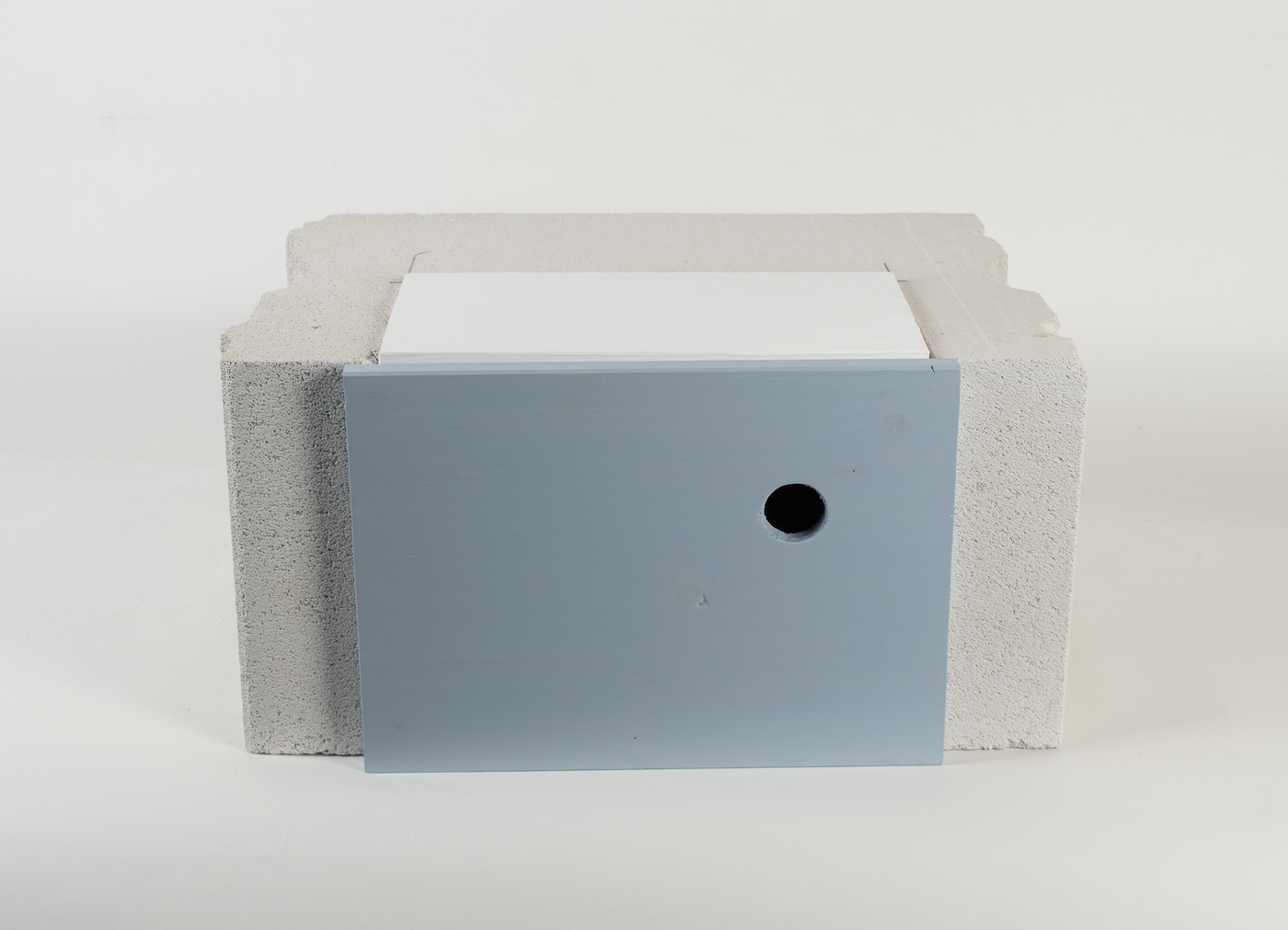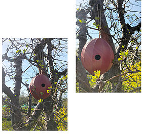 Lena Schild (Masterstudiengang Architektur) fügt ihr „Einfamilienhaus für Familie Klein“ ebenfalls in die Fassade, dafür hat sie den Porenbetonstein gewählt. Ein 36,5 cm Stein bietet genügend Raum für eine Vogelfamilie, das Frontbrett kann individuell an die Fassadenfarbe angepasst oder aber als farblicher Akzent zum Hingucker werden.