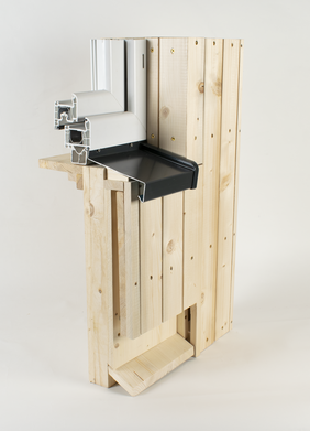 Die Giebelbehausung von Max Petersen (Masterstudiengang Architektur) nutzt den vorhandenen Hausgiebel und bietet ebenfalls Fledermäusen einen Unterschlupf. Auf „Knopfdruck“ lässt sich die untere Klappe öffnen, um die Behausung bei Bedarf zu reinigen.