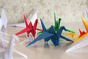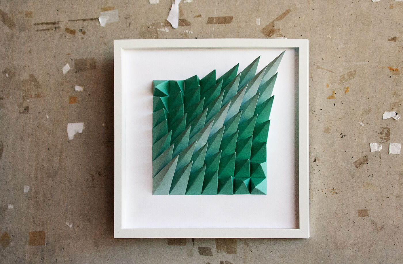 Leaves of trash „Jede Woche finde ich in meinem Briefkasten einen Stapel Zeitungen, den ich – ungeöffnet – direkt in die Papiertonne werfe. Eine offensichtliche Verschwendung von Ressourcen. … Das fertige Bild erinnert an eine Landschaft mit Blumen und Gräsern an einem See oder einer Wasserfläche. Während des Prozesses habe ich gelernt, wie aufwendig und zugleich faszinierend das Falten und Knicken sein kann. Es hat mich beeindruckt, wie aus flachem, zweidimensionalem Papier stabile, dreidimensionale Formen entstehen können, die ganz ohne Klebstoff in ihrer Struktur bestehen bleiben.“ Jennifer Werrenrath