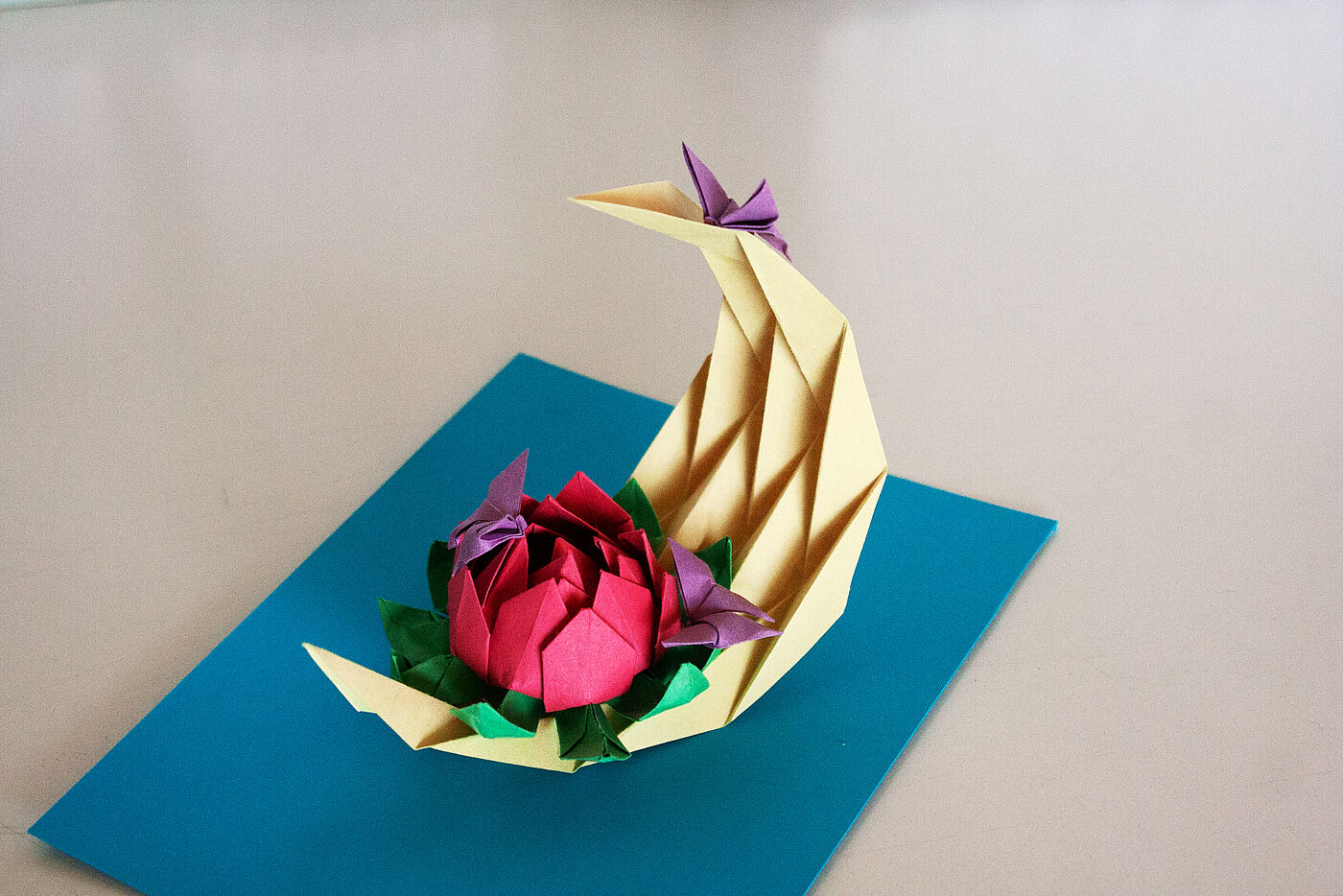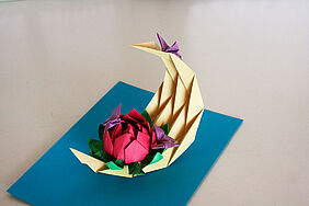 Japanese culture art “Due to my personal interest in Japanese culture and art, I wanted my initial origami design to align with this passion. Therefore, by considering meaningful elements within this culture, I tried to connect them and represent them in a single piece. These elements include the crescent moon, the lotus flower, and the butterfly – each of which carries its own meaning. Mathab Gilani