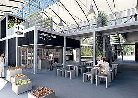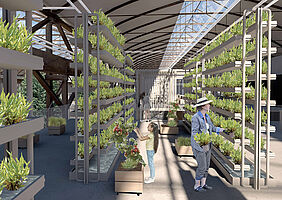 Auf der 30-jährigen Brachfläche entsteht in einem zukunftsweisenden Revitalisierungskonzept ein grünes Quartier mit genossenschaftlichem Wohnraum. Die denkmalgeschützte Wagenrichthalle II wird zur „Grünen Werkstatt“ und vereint nachhaltige Funktionen in Mischnutzung für die Bevölkerung. Die immense Größenordnung der Halle wird im Entwurf für den nachhaltigen, regionalen Indoor Gemüseanbau-und Vertrieb genutzt. In hydroponischen Anbausystemen werden auf der oberen Geschossebene Pflanzen ressourcenschonend und nachhaltig kultiviert. Durch die Kombination mit einer Aquakulturanlage wird ein ganzheitliches Kreislaufkonzept ermöglicht. Weiterhin beinhaltet die Halle diverse bevölkerungsoffene Angebote wie Sharing-Initiativen, Regionalhändler, einen botanischen Lehr-und Schaugarten sowie Mehrzweck-und Veranstaltungsräume.