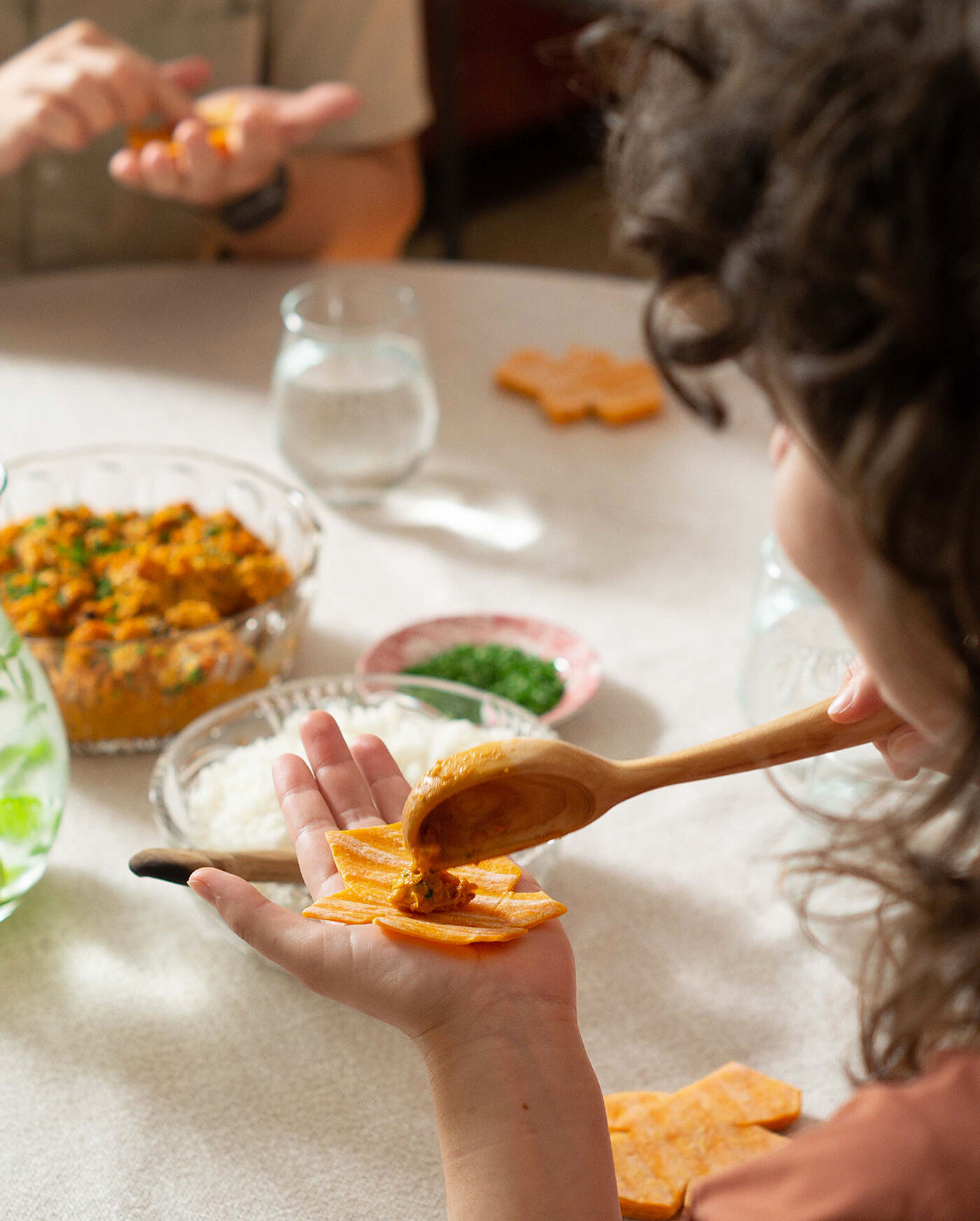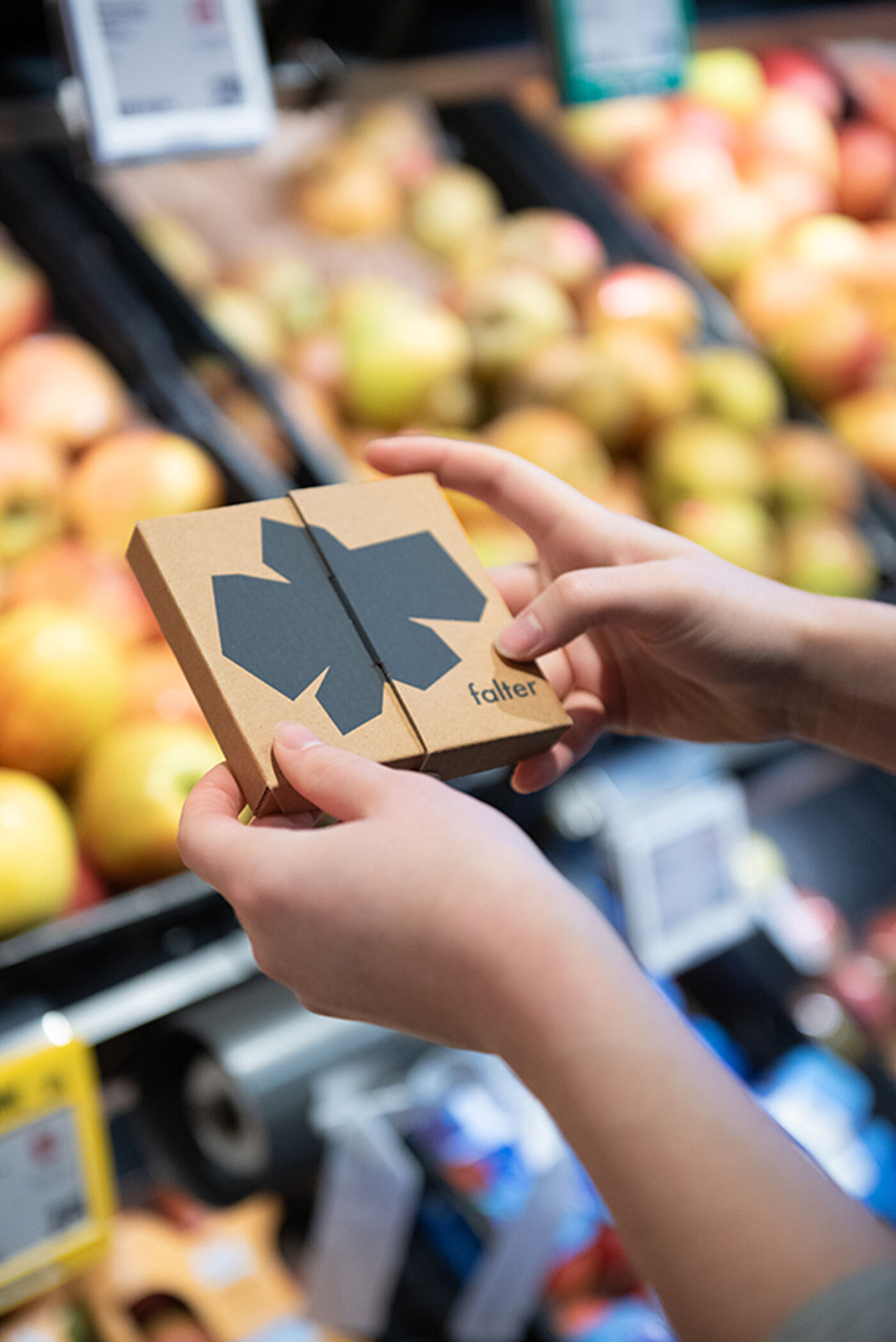 Statt die Zutaten auf einem Teller zu servieren, werden sie auf einem „falter“ angerichtet – die perfekte Portion für den perfekten Bissen. So entsteht eine Alternative zu traditionellem Geschirr und Besteck; die Speisen bleiben in großen Behältern, die am Tisch bereitgestellt werden. Dadurch wird das Essen nicht einfach mitgenommen, sondern bewusst am Tisch verzehrt. Gewohnte Essmuster werden durchbrochen. Gleichzeitig wird die Aufmerksamkeit auf das Essen gelenkt, da Multitasking vermieden wird. Der Faltvorgang lässt das Essen zu einem Ritual werden, dass die Wertschätzung und Achtsamkeit steigert. Ddurch die Konsistenz des falters wird das Kauen intensiviert.