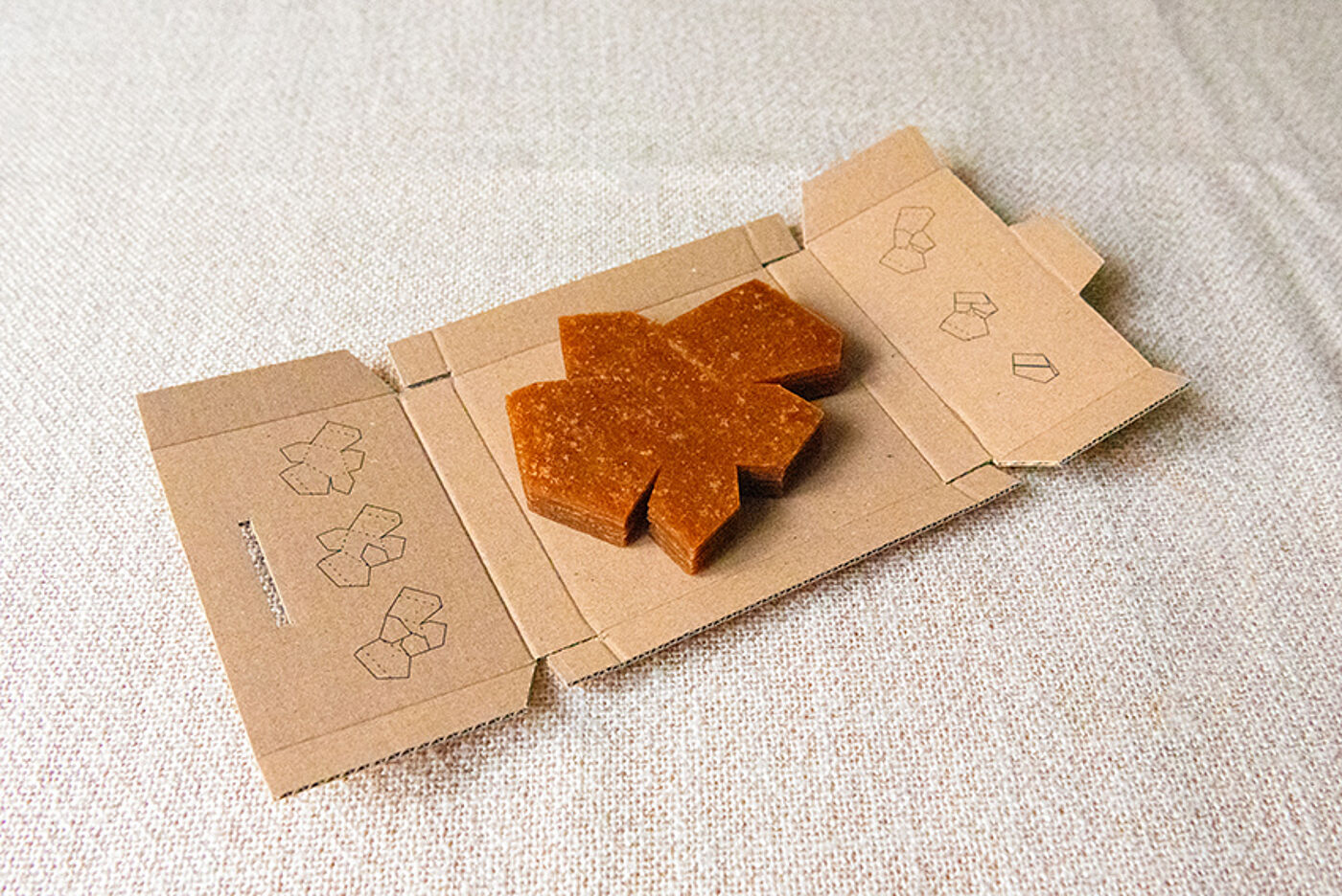 Die Form des falters besteht aus einem asymmetrischen Fünfeck, das sich sanft an die Handfläche anschmiegt. Die obere linke Kante orientiert sich am Daumen. Die Reihenfolge des faltens wird durch die Größe der Flügel bestimmt. Die Perforation visualisiert nicht nur, wo die Flügel gefaltet werden müssen, sondern erleichtert auch das Falten.