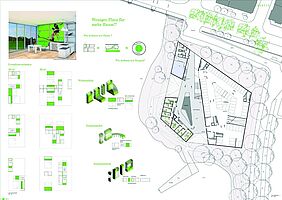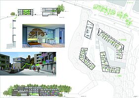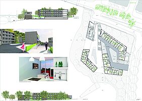 Die Entwerfer entwickeln für das Gebiet die städtebauliche Grundfigur eines „gebrochenen Blocks“, die auf die topografischen Gegebenheiten des Ortes reagiert. Wasserlauf und Wasserhafen werden in die durch die verschränkten Gebäudekörper differenzierten, auf unterschiedlichen Ebenen entwickelte Außenräume einbezogen. Freitreppen verbinden diese Räume und lassen zusammen mit ergänzenden gastronomischen Einrichtungen in den Erdgeschossen eine belebende Nutzung erwarten.