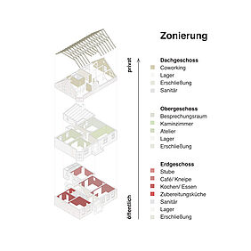 „Dorf“ als Verbindung zu den Einheimischen und somit meinen potenziellen Nutzer*innen. „Werk“, um die vielfältigen Werkstätten und das damit verbundene werkeln, was auf dem Hof stattfindet, aufzugreifen. Aber auch als Schaffenswerk der Dörfler kann dies interpretiert werden, eben für einen lebendigen Ortskern.