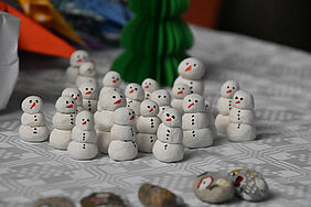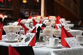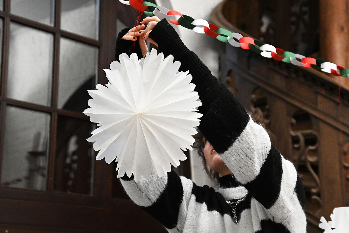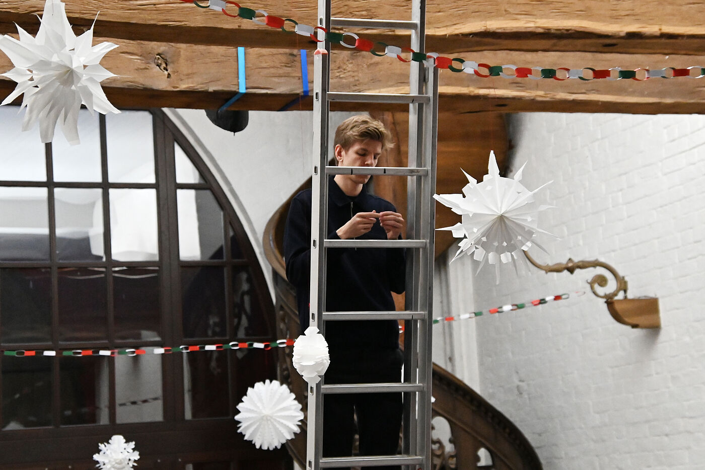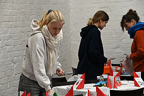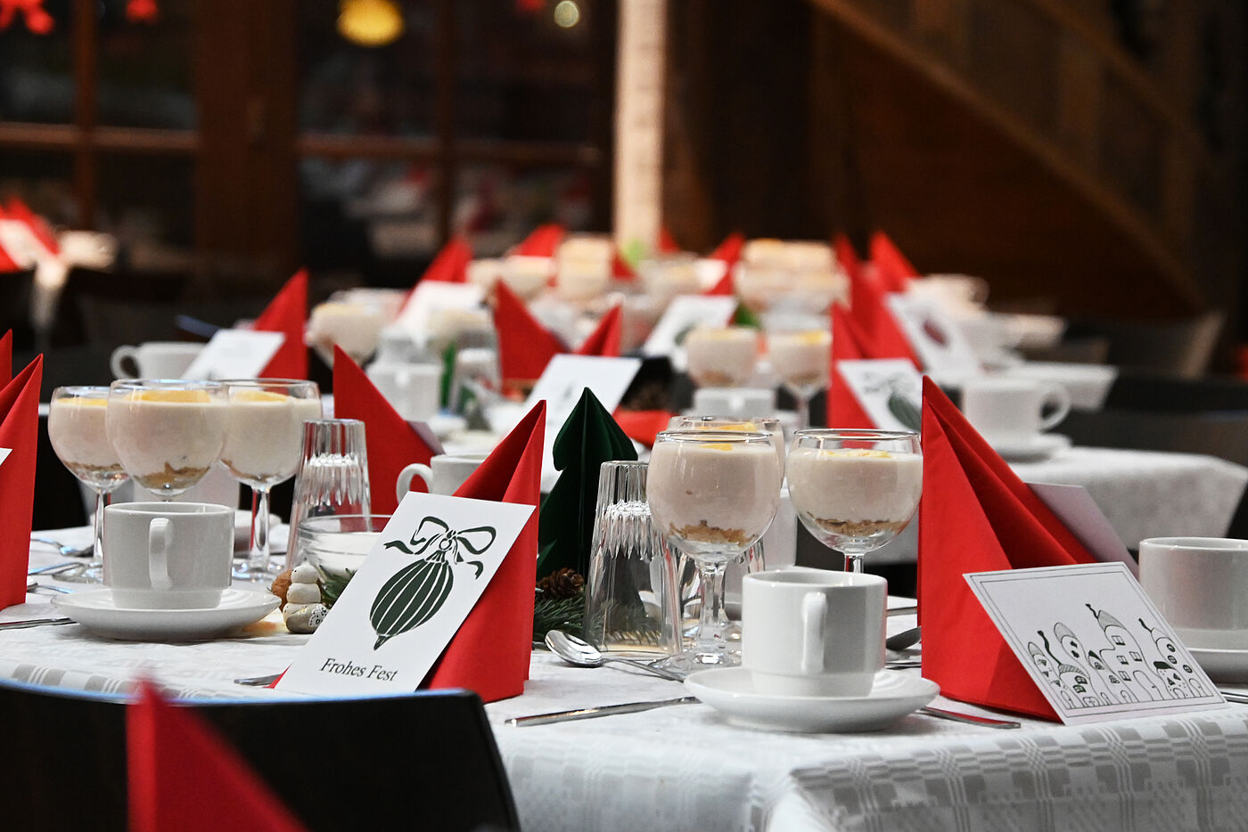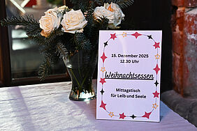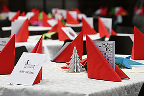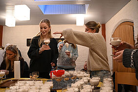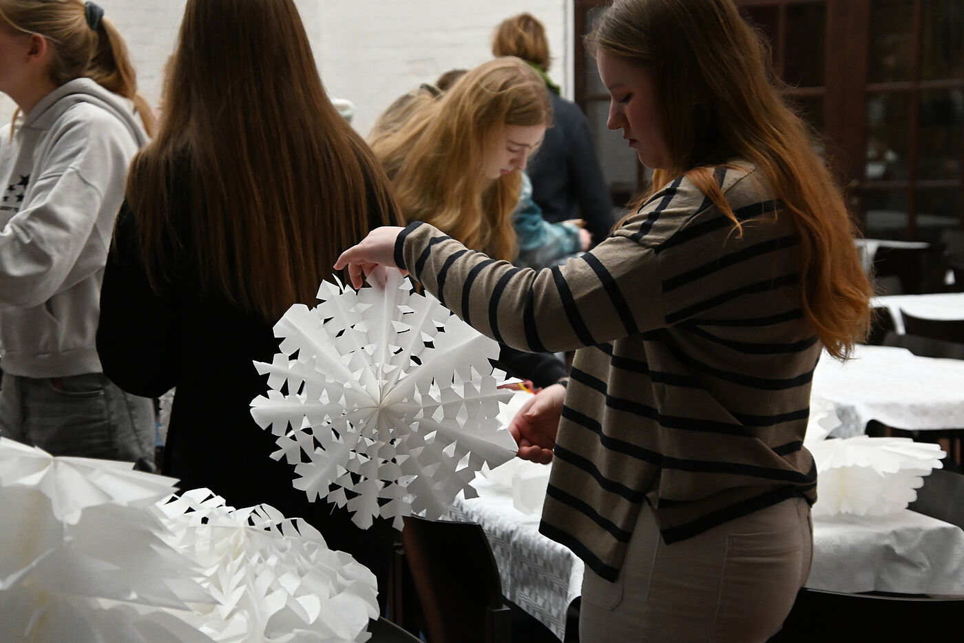 Bereits ab 8 Uhr morgens verwandelten die Studierenden die Winterkirche in einen festlichen, warmen Ort. Die gesamte Dekoration hatten sie im Vorfeld selbst angefertigt – neben ihren regulären Lehrveranstaltungen. Papiersterne und Lichterketten schmückten den Raum, auf den Tischen standen kleine Papiertannenbäume, bunte Sterne und Schneemännchen. Für jede Besucherin und jeden Besucher lag eine Weihnachtskarte bereit. Die Tische waren festlich gedeckt, die Winterkirche strahlte eine besondere Atmosphäre aus.