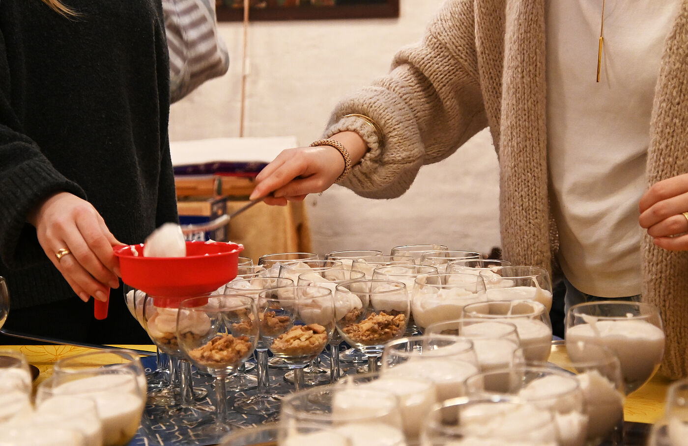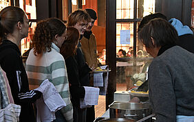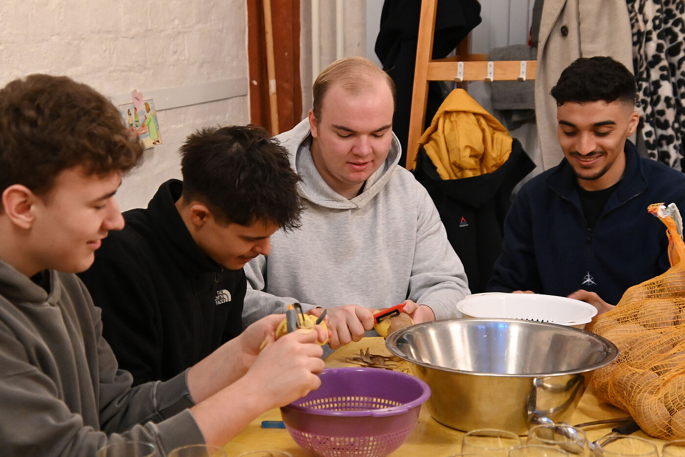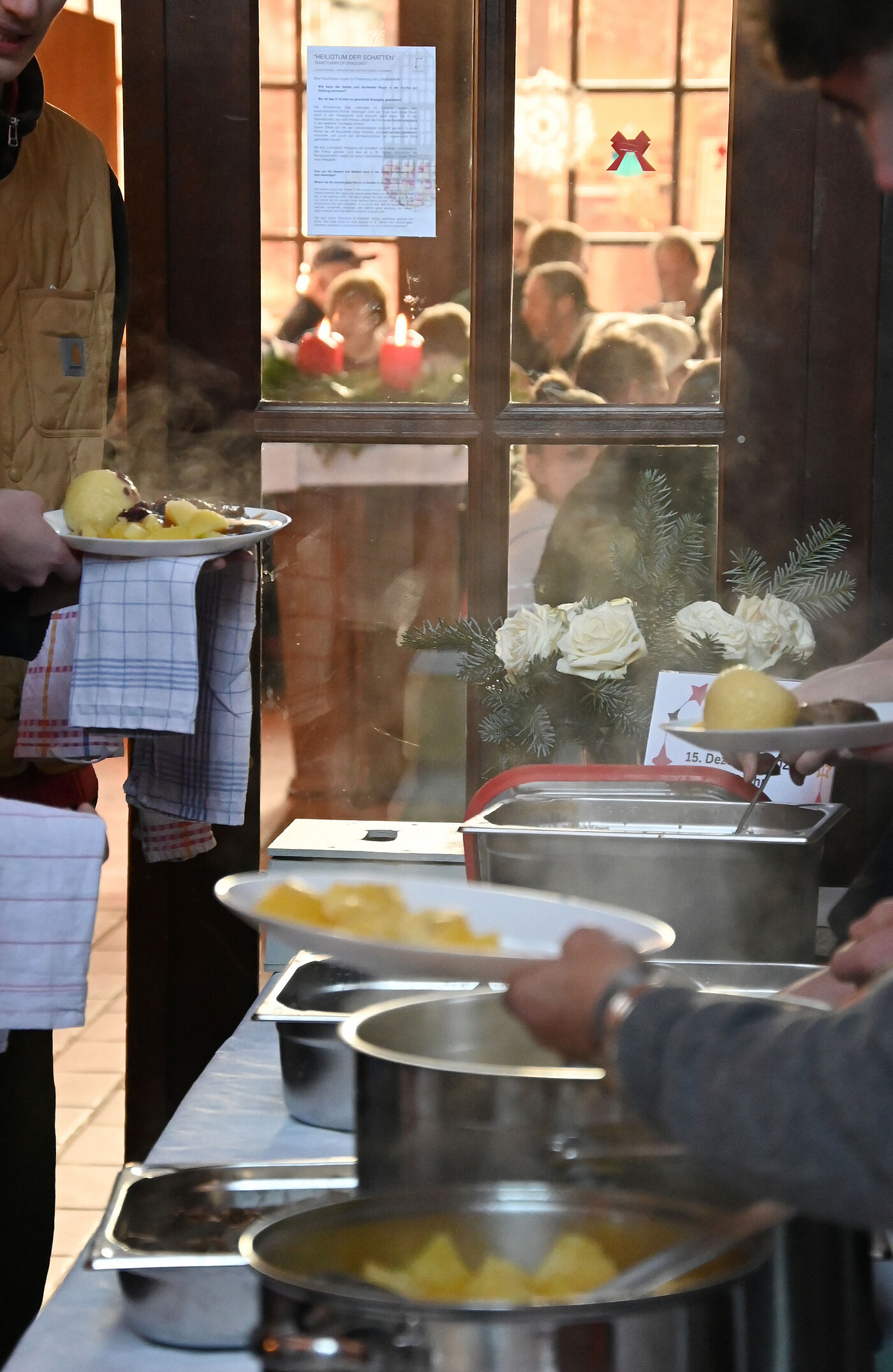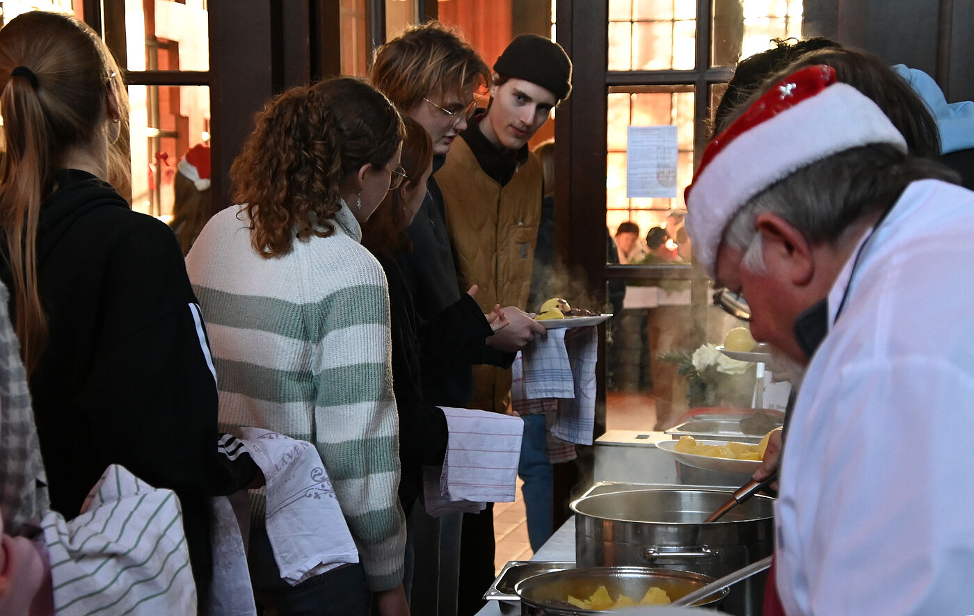 Auch in der Küche wurde tatkräftig angepackt: Säckeweise Kartoffeln wurden geschält, Quarkdesserts in Gläser gefüllt und überall dort geholfen, wo Unterstützung gebraucht wurde. Ab dem Mittag füllte sich die Winterkirche, fast alle Plätze waren besetzt. Pastorin Antje Exner begrüßte die Gäste, dankte den Ehrenamtlichen des Mittagstisches und den Studierenden. Nach einer kurzen Weihnachtsgeschichte und gemeinsamem Singen wurde das Essen serviert – ebenfalls von den Studierenden.