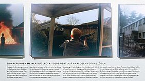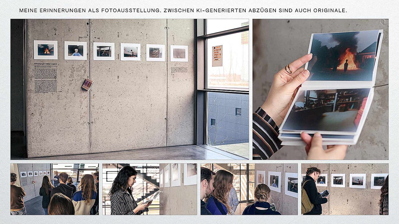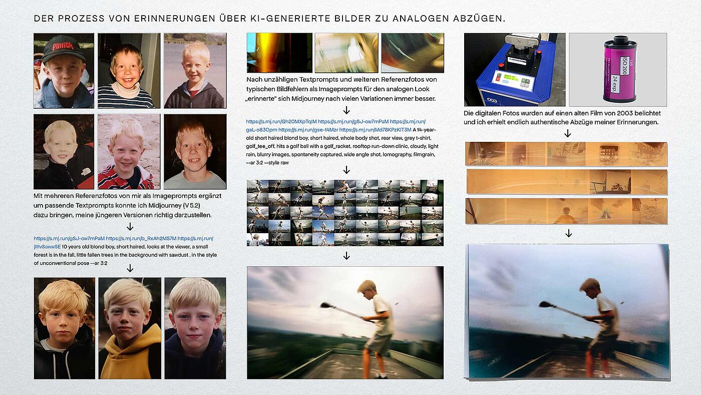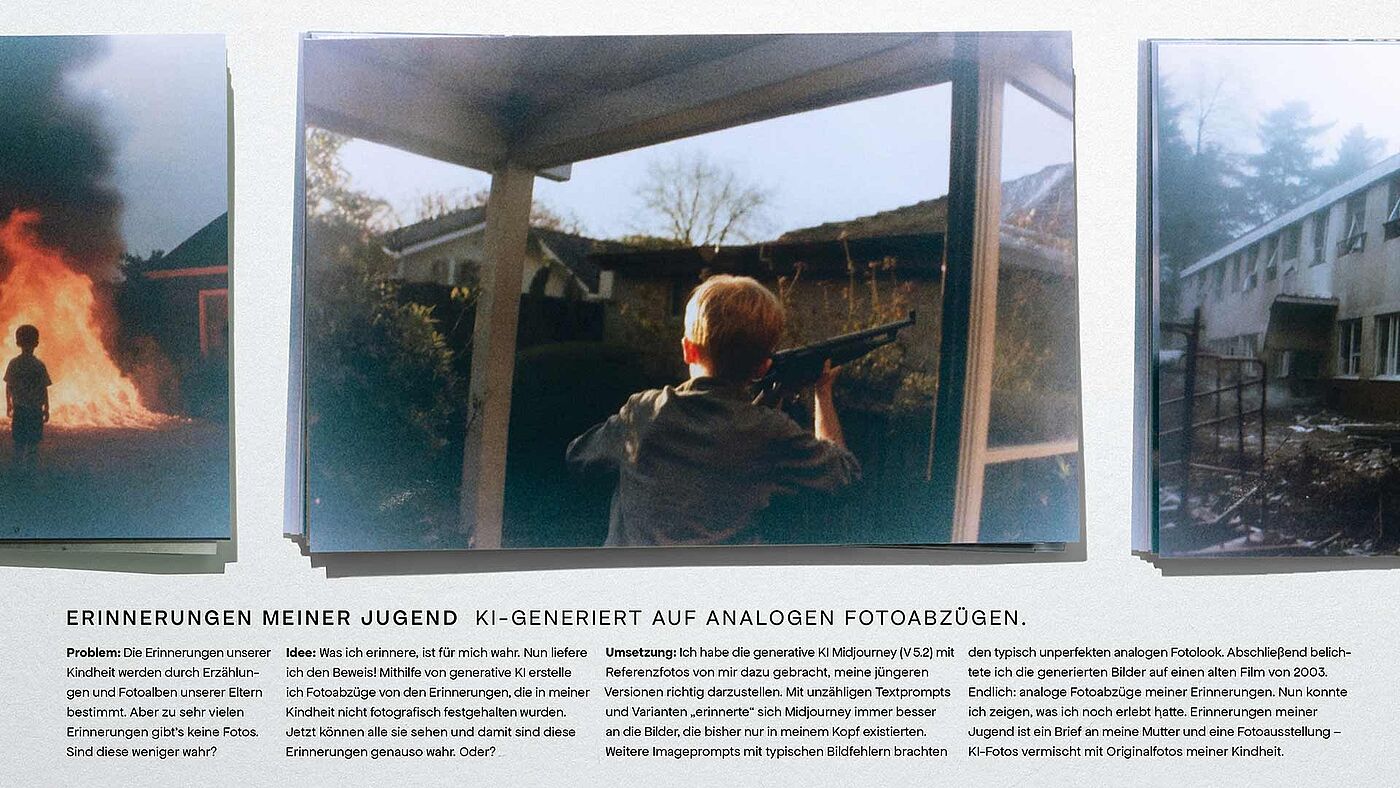 Neben dem Erlernen von KI-Tools stand vor allem auch die Entwicklung und Umsetzung von Ideen im Mittelpunkt. Denn KI sollte nie Selbstzweck sein. Hier hat sich Fabian Gröger auf sehr sensible und reflektierte Art und Weise den Bildern in unseren Köpfen gewidmet. Wir alle tragen Erinnerungen mit uns herum, doch wissen wir nicht, ob sie wahr sind. Sind sie weniger wahr, nur weil es keine Fotos davon gibt? Werden sie wahr, wenn es davon Fotos gäbe?