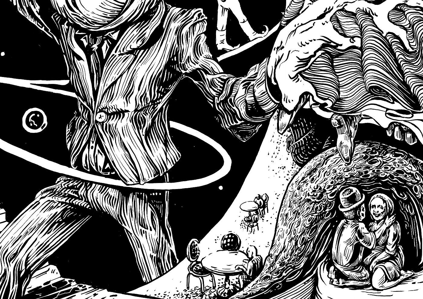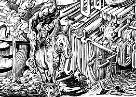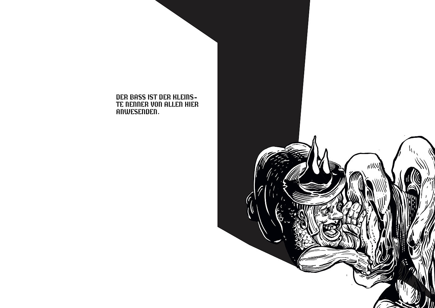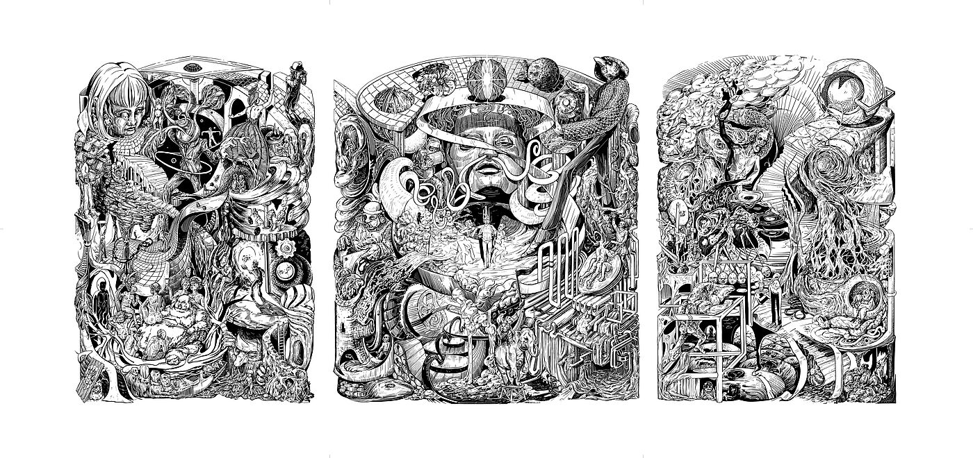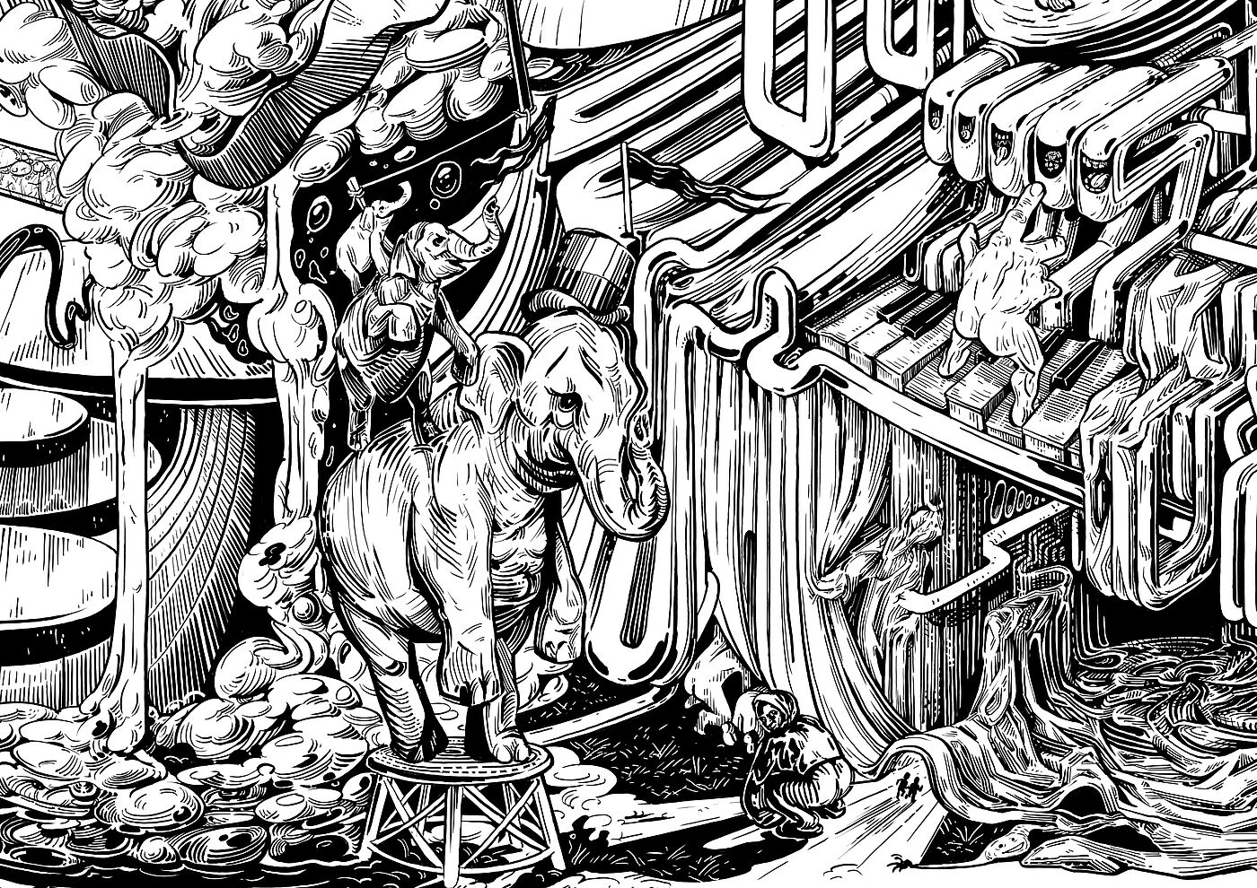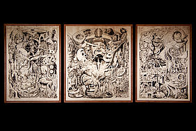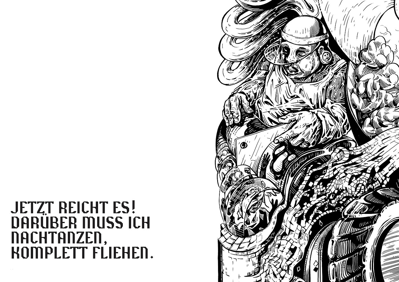 Ich benutze meine Erfahrungen aus der Welt des Hedonismus, der Prokrastination und des Eskapismus, treffe Beobachtungen und verarbeite diese in Bildern und Symbolen, um einen surrealen Mikrokosmos zu konstruieren, der als illustrierte Reportage für die Betrachter*innen erlebbar wird. Durch den Wimmelbildcharakter und die Größe werden die Betrachtenden angehalten, sich Zeit zu nehmen um der Realität zu entfliehen, Details zu entdecken, Symbole und Klischees zu erkennen, einzuordnen und eine eigene Interpretation der Geschichte zu dem Bild entwickeln.