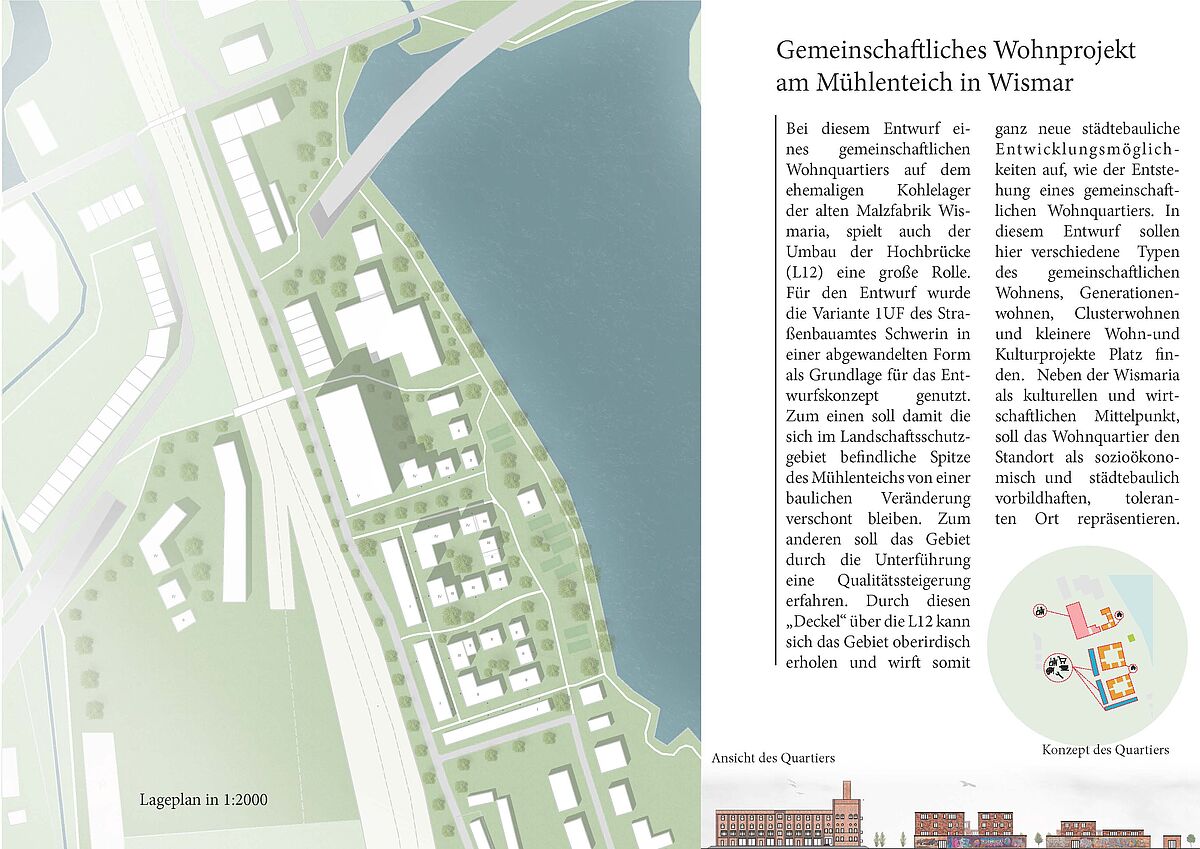 Der Entwurf stellt die Erarbeitung eines Wohnprojektes für eine Baugruppe dar. Der Standort wurde am Mühlenteich der Hansestadt Wismar gefunden. Der städtebauliche Missstand im Bereich von Platter-Kamp und Hochbrücke am Mühlenteich verlangt nach einer Neuordnung der baulichen Situation. Dabei sollte eine Lösung gefunden werden, die gemeinschaftliche und soziale Wohnkonzepte ermöglicht und der naturräumlichen Besonderheit des Standortes gerecht wird.
