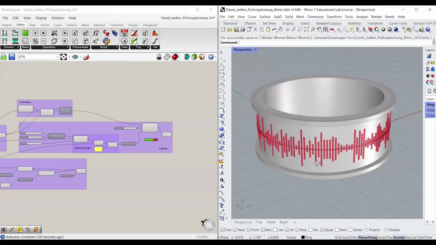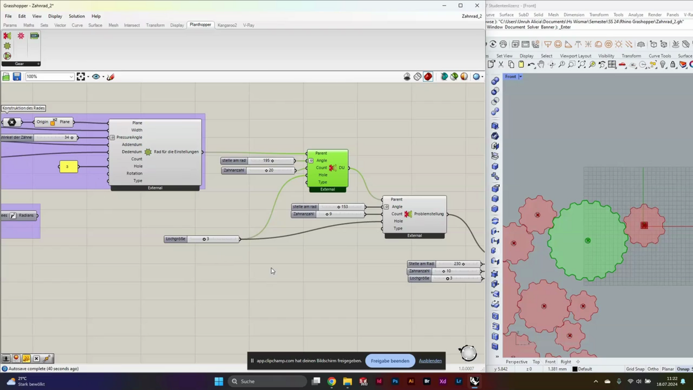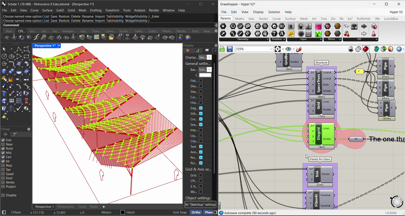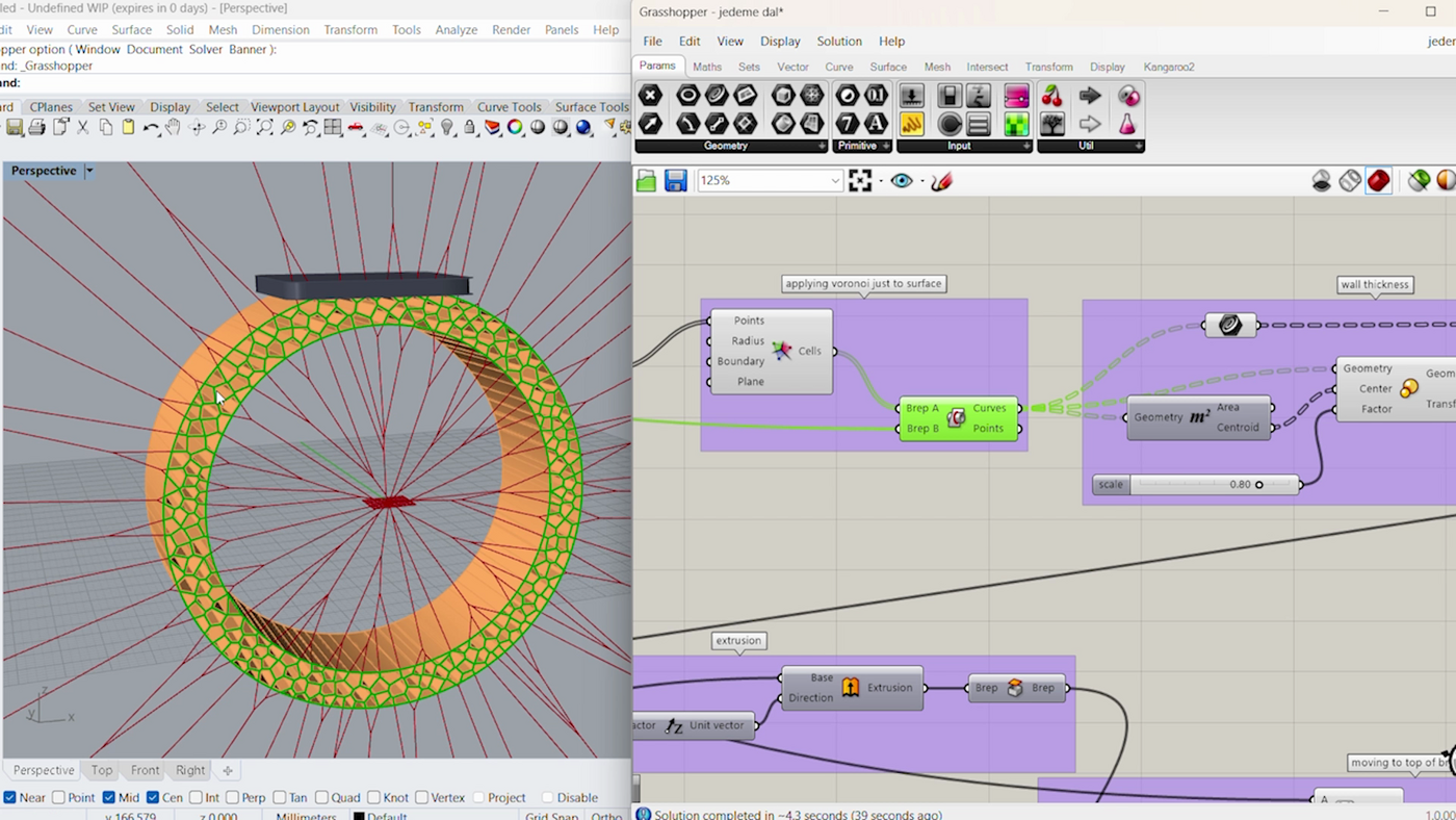 Grasshopper als Bestandteil von Rhino ist eine Umgebung, die das Erstellen solcher Generierungswerkzeuge erleichtert. Es ist eine visuelle Programmiersprache mit dem Fokus auf der algorithmischen Generierung und Manipulation von Geometriedaten. Grasshopper vereinfacht das Erstellen komplexer Geometrie, hilft bei der Berücksichtigung verschiedener Parameter in der Formfindung und automatisiert die Vorbereitung eigener Entwürfe für digitale Produktionsverfahren.