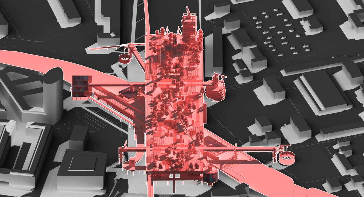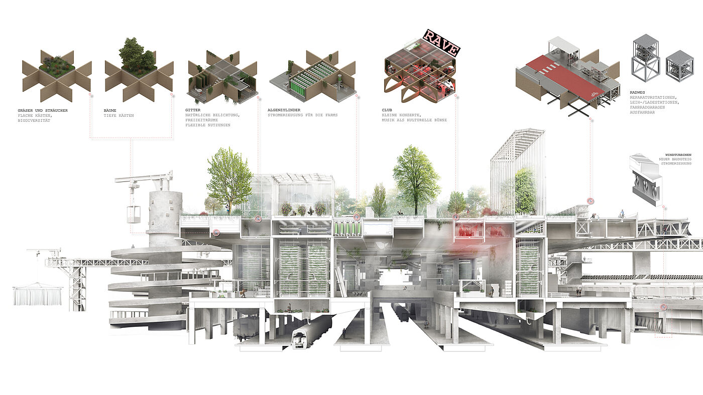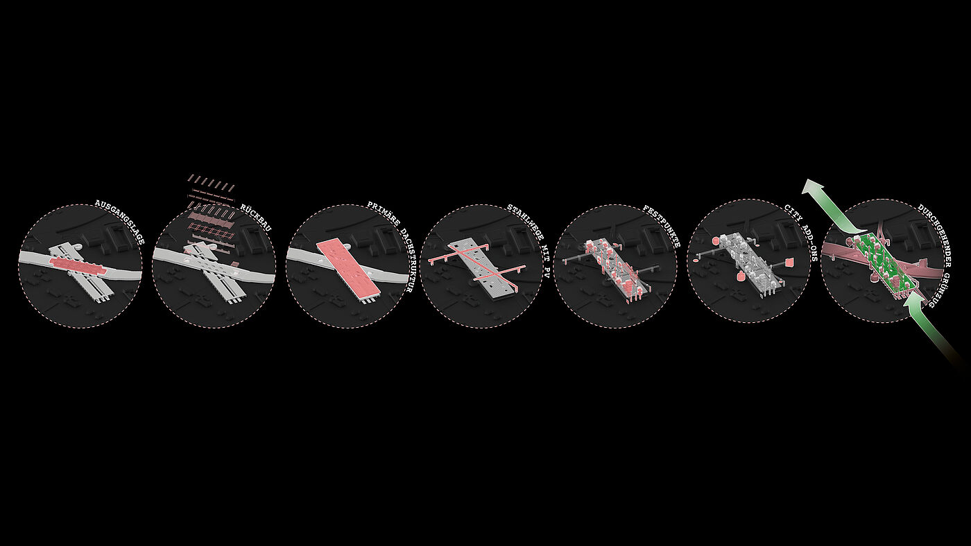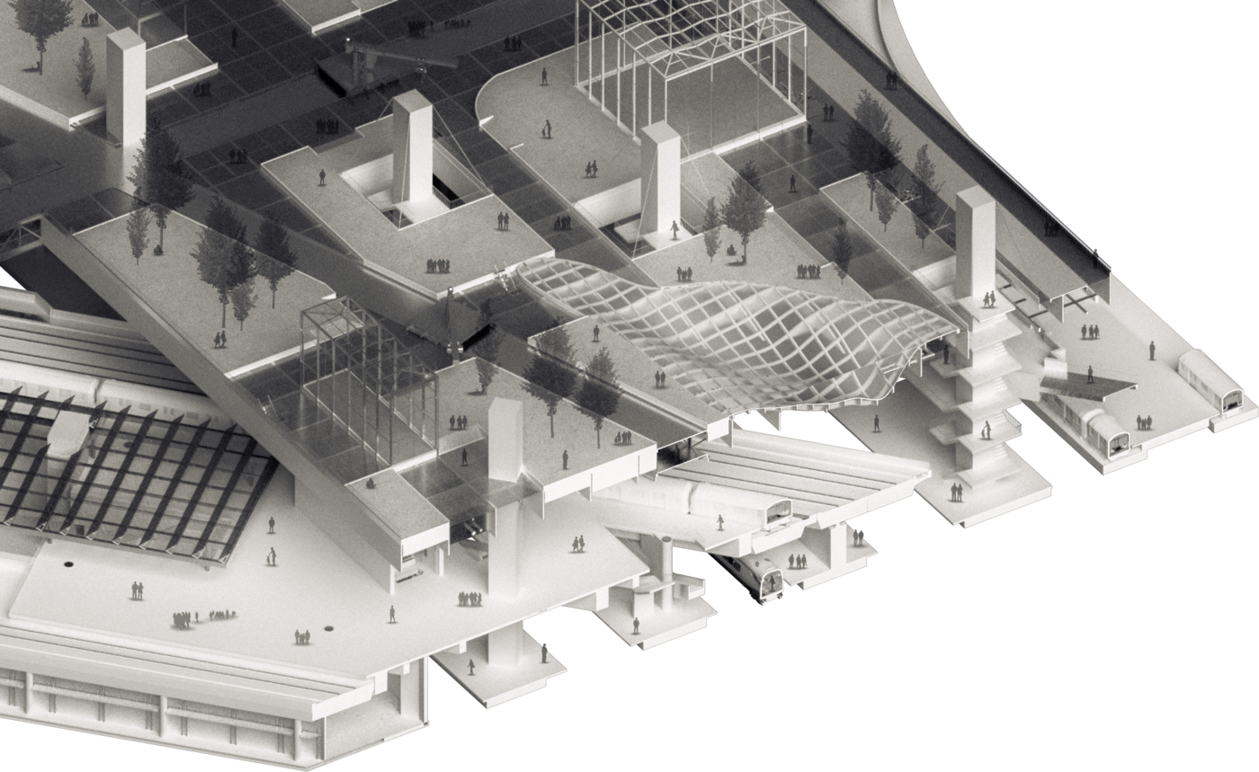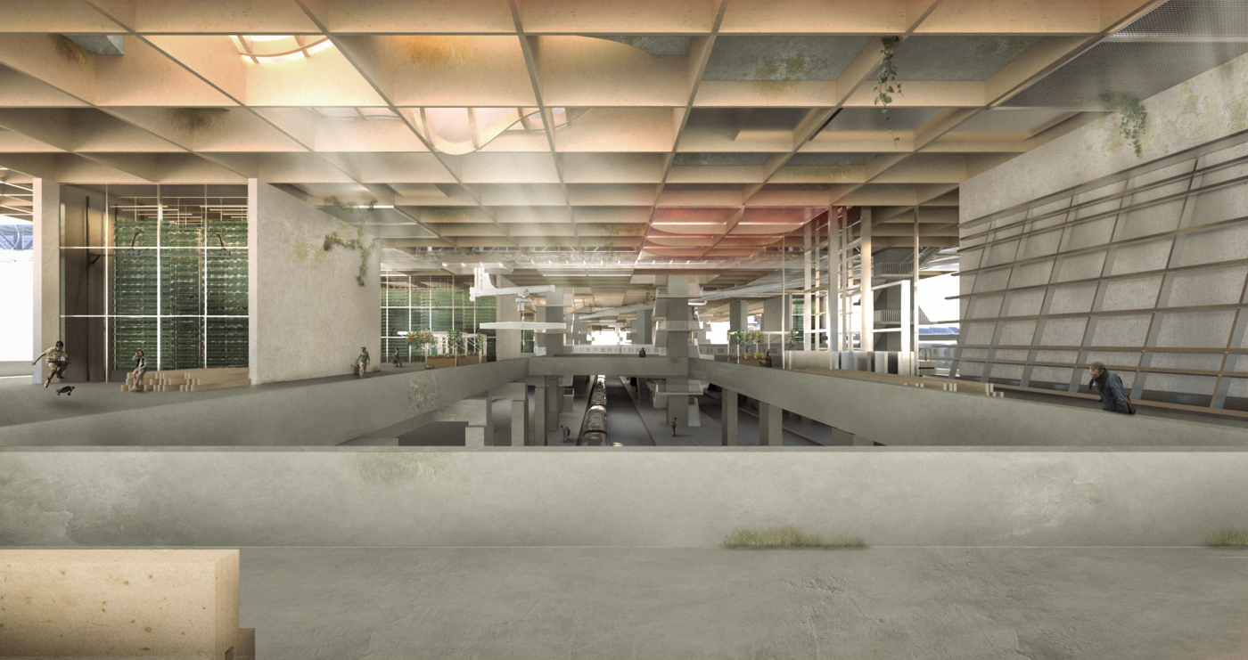 Das Konzept reaktiviert den isolierten Bahnhof, indem er punktuell mit dem umliegenden Stadtgewebe verbunden wird und so den unterbrochenen Nord-Süd-Grünzug nahtlos integriert. Ein modularer Dachaufbau mit ca. 4 Meter Binderhöhe schafft flexible, nutzbare Räume, in denen Plug-ins je nach kulturellen und funktionalen Anforderungen angepasst werden können. Durch die Integration der alten Autozufahrt und Neupositionierung entstehen direkte Zugänge zu den Parkdecks, die als Urban Storage und Plattform für Urban Farms dienen. Letztere verbinden Nahrungsmittelproduktion, Technik und Natur – unterstützt durch intelligentes Regenwassermanagement und Algenpaneele zur Ressourcenschonung. Ein interaktives Technologiezentrum am südlichen Eingang bietet Einblicke in nachhaltige Prozesse und lädt Bürger zu Workshops ein. Zusätzlich fördert die Einbindung naturnaher Elemente das Bewusstsein für urbane Fauna und schafft einen lebendigen, partizipativen Raum, der den Bahnhof als integrativen Knotenpunkt eines dynamischen urbanen Netzwerks neu definiert.
