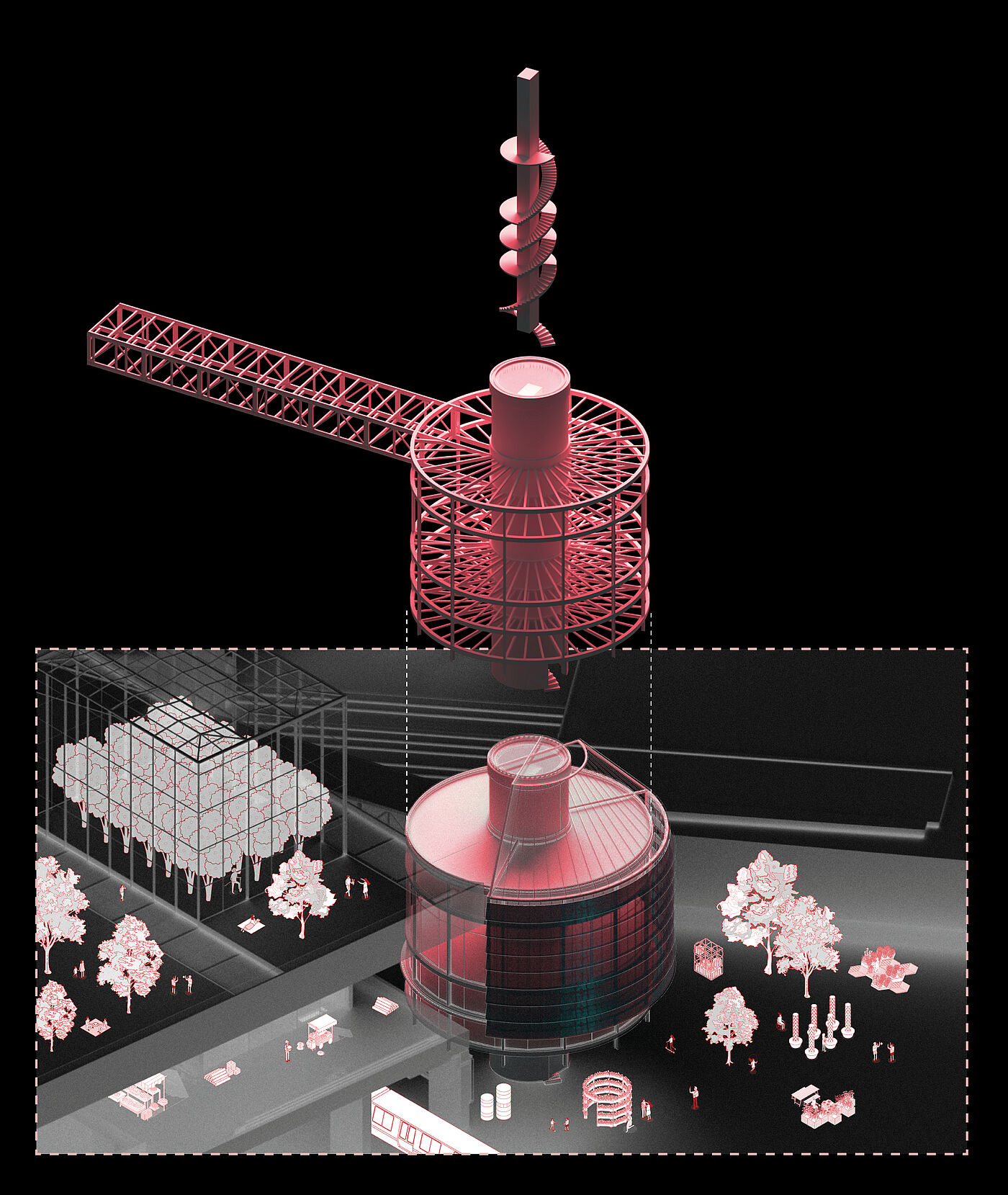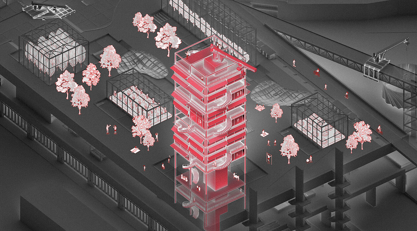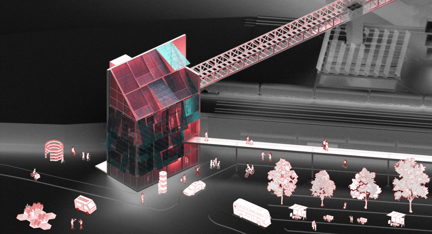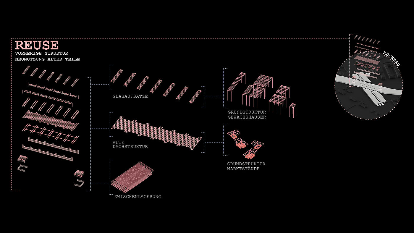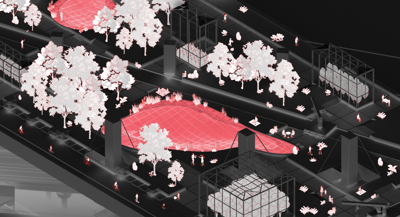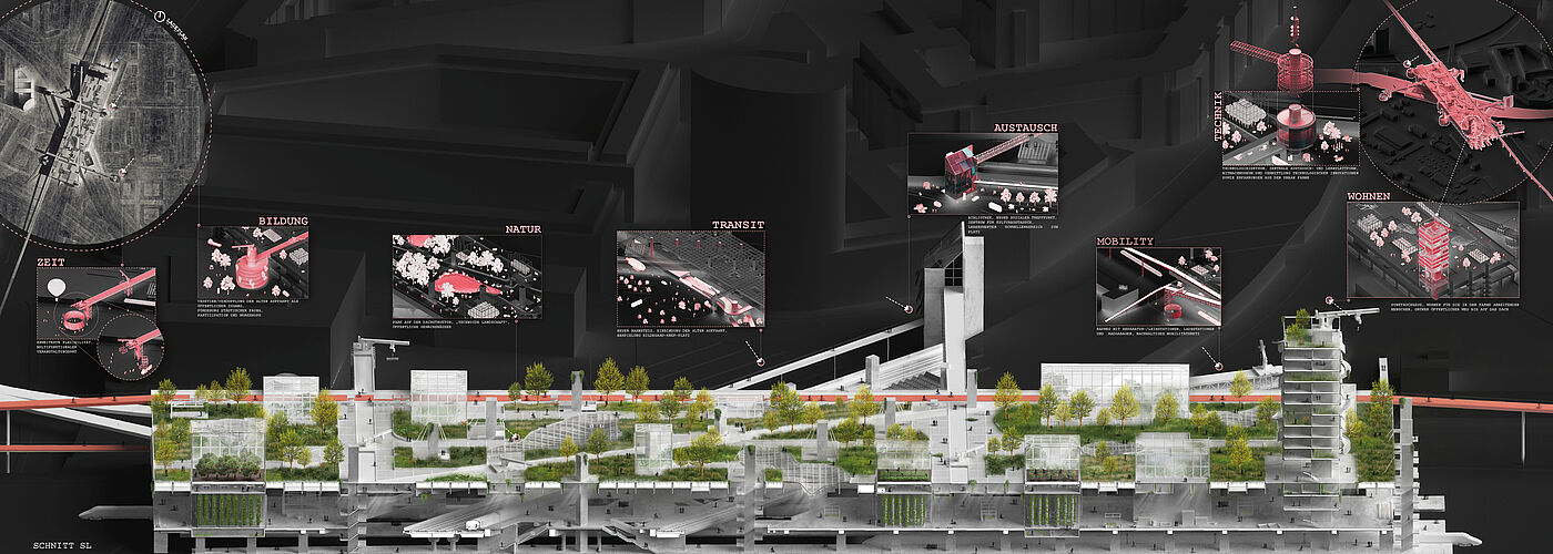 Das Konzept reaktiviert den isolierten Bahnhof, indem er punktuell mit dem umliegenden Stadtgewebe verbunden wird und so den unterbrochenen Nord-Süd-Grünzug nahtlos integriert. Ein modularer Dachaufbau mit ca. 4 Meter Binderhöhe schafft flexible, nutzbare Räume, in denen Plug-ins je nach kulturellen und funktionalen Anforderungen angepasst werden können. Durch die Integration der alten Autozufahrt und Neupositionierung entstehen direkte Zugänge zu den Parkdecks, die als Urban Storage und Plattform für Urban Farms dienen. Letztere verbinden Nahrungsmittelproduktion, Technik und Natur – unterstützt durch intelligentes Regenwassermanagement und Algenpaneele zur Ressourcenschonung. Ein interaktives Technologiezentrum am südlichen Eingang bietet Einblicke in nachhaltige Prozesse und lädt Bürger zu Workshops ein. Zusätzlich fördert die Einbindung naturnaher Elemente das Bewusstsein für urbane Fauna und schafft einen lebendigen, partizipativen Raum, der den Bahnhof als integrativen Knotenpunkt eines dynamischen urbanen Netzwerks neu definiert.