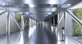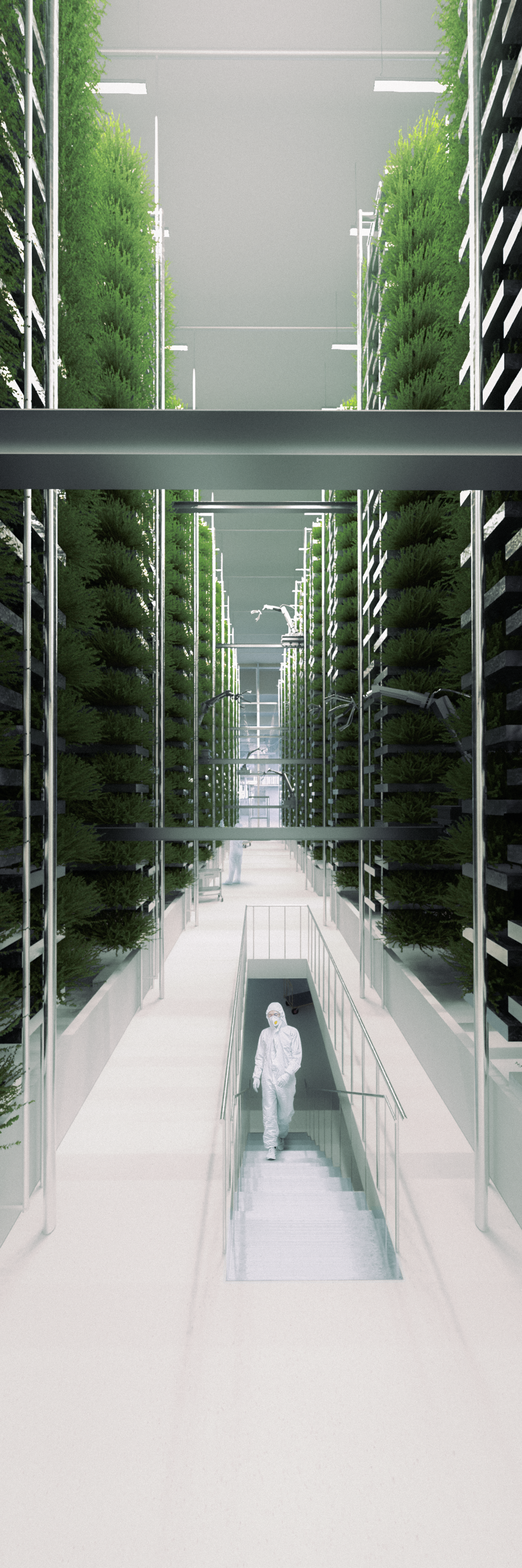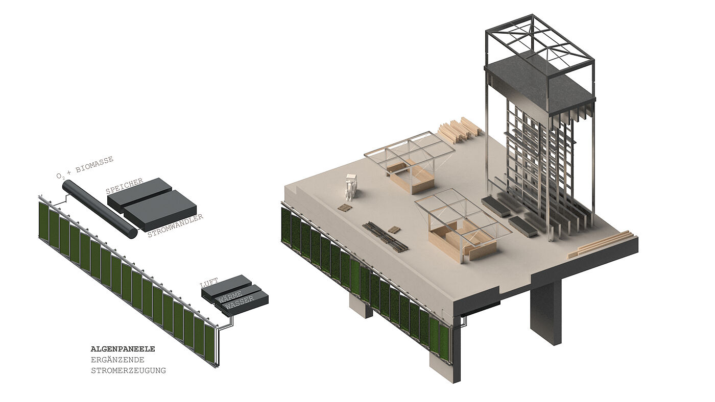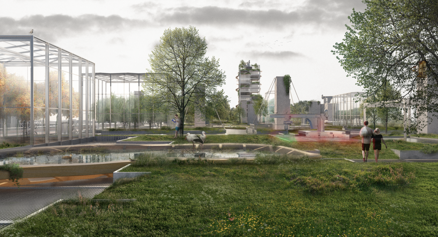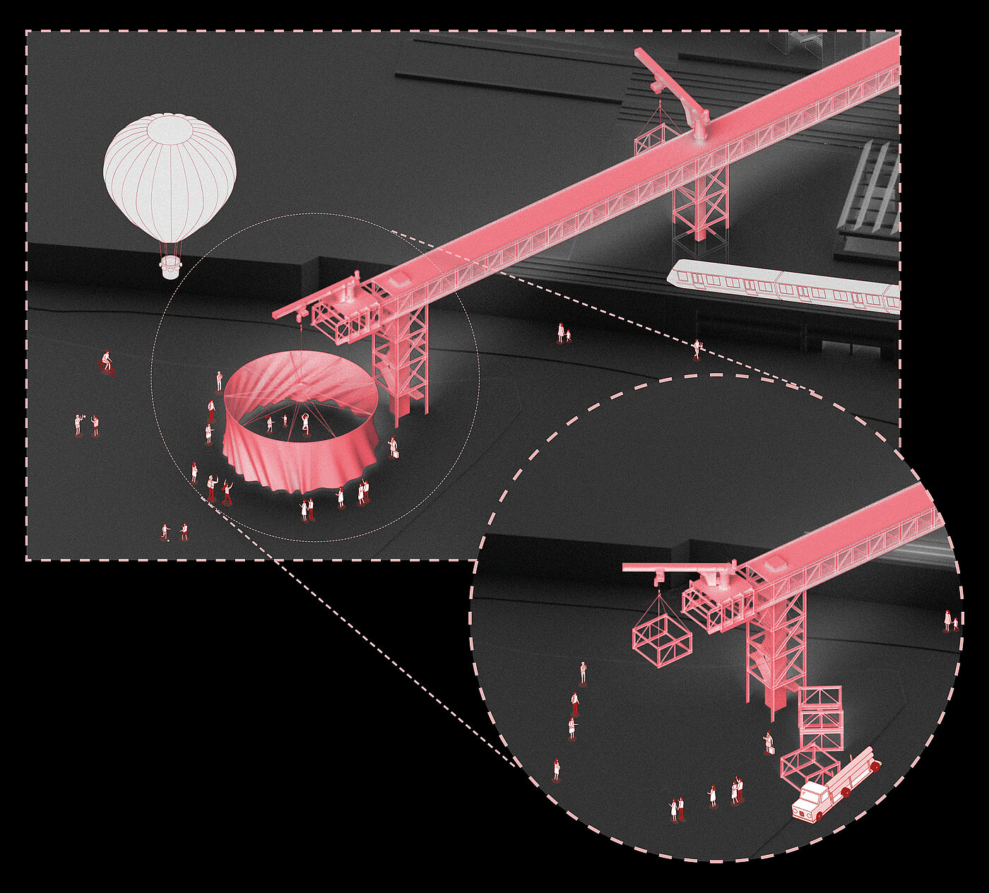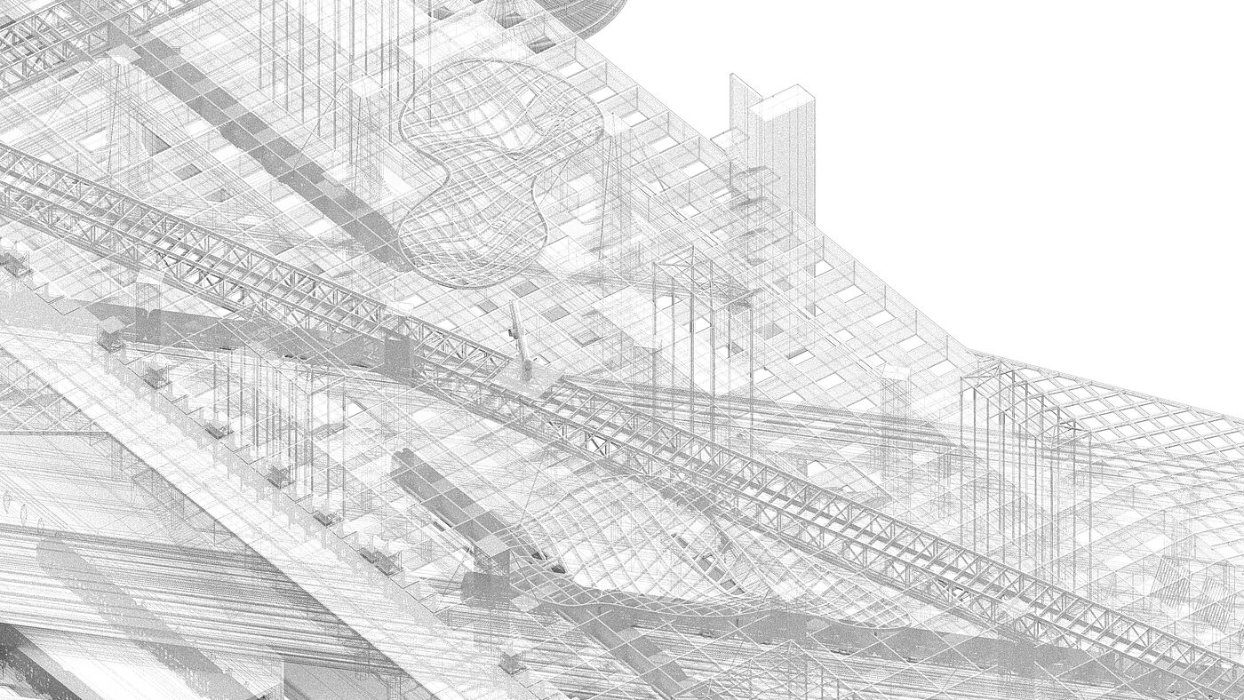 Das Konzept reaktiviert den isolierten Bahnhof, indem er punktuell mit dem umliegenden Stadtgewebe verbunden wird und so den unterbrochenen Nord-Süd-Grünzug nahtlos integriert. Ein modularer Dachaufbau mit ca. 4 Meter Binderhöhe schafft flexible, nutzbare Räume, in denen Plug-ins je nach kulturellen und funktionalen Anforderungen angepasst werden können. Durch die Integration der alten Autozufahrt und Neupositionierung entstehen direkte Zugänge zu den Parkdecks, die als Urban Storage und Plattform für Urban Farms dienen. Letztere verbinden Nahrungsmittelproduktion, Technik und Natur – unterstützt durch intelligentes Regenwassermanagement und Algenpaneele zur Ressourcenschonung. Ein interaktives Technologiezentrum am südlichen Eingang bietet Einblicke in nachhaltige Prozesse und lädt Bürger zu Workshops ein. Zusätzlich fördert die Einbindung naturnaher Elemente das Bewusstsein für urbane Fauna und schafft einen lebendigen, partizipativen Raum, der den Bahnhof als integrativen Knotenpunkt eines dynamischen urbanen Netzwerks neu definiert.