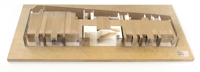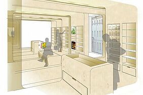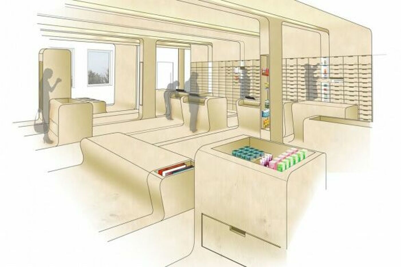 Eine zu diesem Zweck eingebrachte Hülle dient einerseits als Verbindungselement zwischen der Apotheke und dem angeschlossenen Reform- und Sanitätshaus. Anderseits schützt die Schnittstelle zum Außenraum seine Kunden vor unerwünschten Einblicken. Die durch verschiedene Transformationen entstandenen umlaufenden Bänder nehmen die notwendigen Funktionen auf. Zentrales Gestaltungselement im Verkaufsraum bilden schließlich Schubsäulen, die der Unterbringung sämtlicher Medikamente und der Sichtwahl dienen.