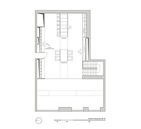 Der Showroom im Erdgeschoss präsentiert die handgefertigten Messer in einem klar strukturierten Raumkonzept. Travertin, Aluminium und satiniertes Glas greifen Materialien aus dem Herstellungsprozess auf und verbinden Produkt und Architektur. Die drehbare Präsentationswand mit 63 Modulen inszeniert die Messer bei Bedarf wirkungsvoll – oder verschwindet dezent in einer geschlossenen Aluminiumfläche. Ein Durchgang in dieser Wand führt in den Informationsbereich, wo Besucher Einblicke in die Schmiedekunst erhalten. Rohlinge in verschiedenen Bearbeitungsstufen, ein versenkter Informationstresen und hochwertige Materialien machen das Handwerk greifbar. Im Obergeschoss können Kund*innen ihr eigenes Messer konfigurieren – von der Klingenform bis zum Griffmaterial. Im Workshopbereich lernen sie den Umgang mit den Produkten, vom richtigen Schleifen bis zur Pflege. Auch hier bleibt die Gestaltung zurückhaltend und hochwertig – ganz im Zeichen von Reinheit, Meisterschaft und Perfektion.