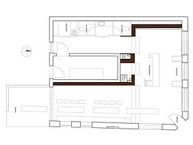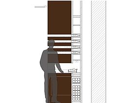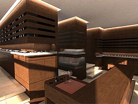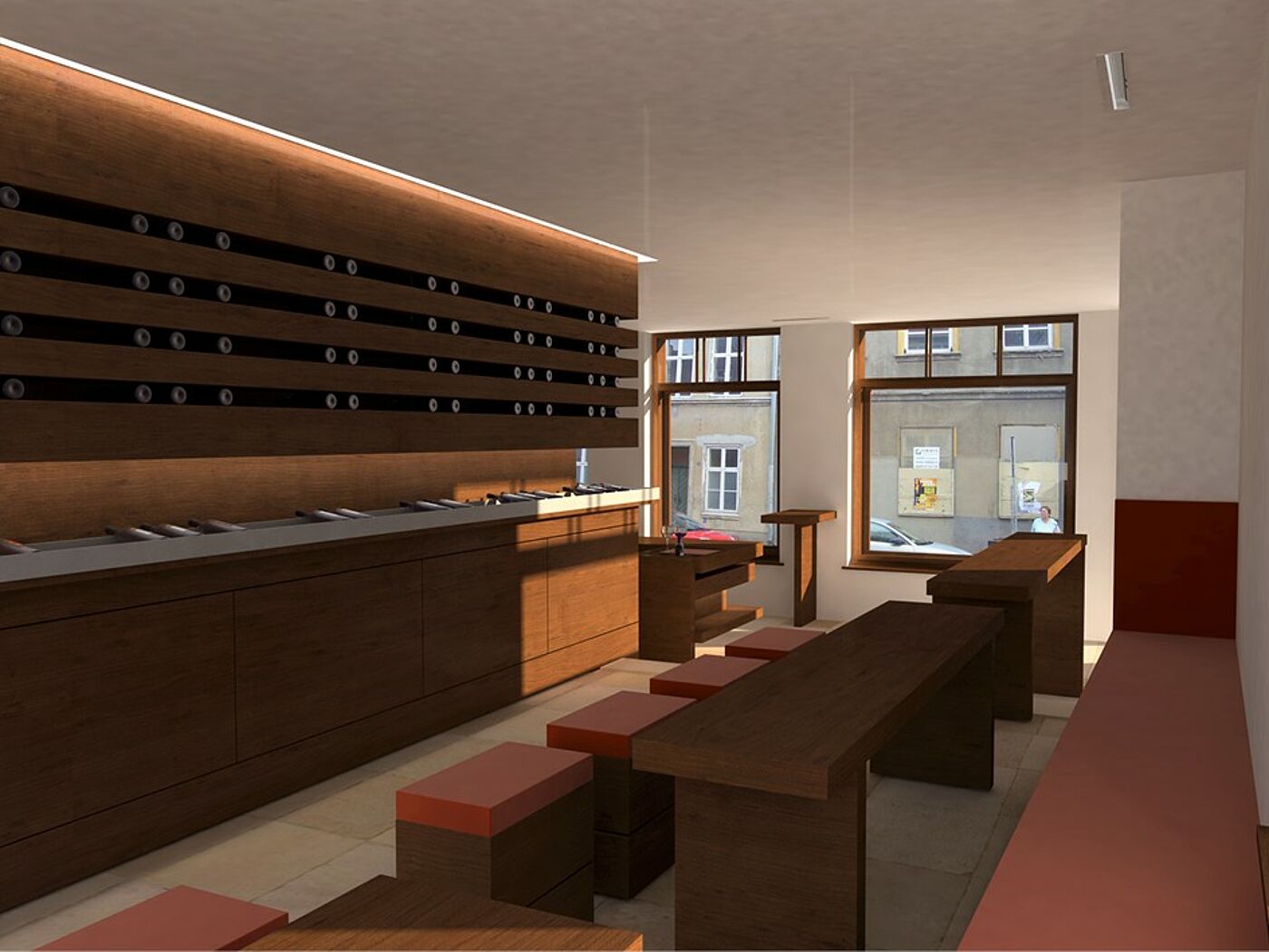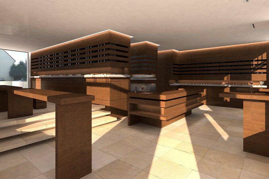 Das bestimmende raumstrukturierende Element dafür ist eine Funktionswand aus Eichenholz. Ihr bauliches Prinzip geht von der liegenden Präsentation und Lagerung der Flaschen und Weinkartons aus. Die Wand ist in drei Ebenen horizontal gegliedert. In der Mitte befindet sich eine Aussparung für ausgesuchte Weine. Der Tresen ist Verkaufs-, Probiertisch und Lagermöglichkeit zugleich. Im vorderen Bereich der Weinhandlung gibt es Stehtische, die auf dem Podest in einen Sitzbereich übergehen. Hier ist Raum für Weinverkostungen, Weinseminare und Gesellschaften. Die Funktionswand wird am historischen Ort zum wesentlichen Funktionselement einer zeitgenössischen Präsentation von hochwertigen Weinen.