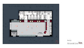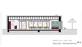 Die Theke besteht aus vier mobilen Elementen, die je nach Bedarf verschoben und umgenutzt werden können. Der Rücktresen ist mit Falttüren flächenbündig verschließbar. Um die Anzahl der losen Bestuhlung zu minimieren, ist der Fensterrahmen etwas breiter ausgebildet und dient somit sowohl innen als auch außen als Sitzbank. Die große Fensterfront stellt außerdem einen Bezug zwischen dem Innen- und Außenraum her. Zur Südseite öffnet sich eine Terrasse, die mit flexiblen Liegestühlen und Bänken zum Verweilen einlädt.
