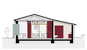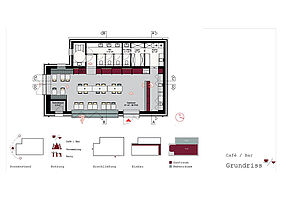 Um die Barrierefreiheit zu gewährleisten, wird der Boden im Inneren um 23,5 cm aufgeschüttet und so ebenerdig zum Außenraum. Ein in der Gestalt flexibles Einbauelement trennt den Gastraum von den Nebenräumen und bietet Stauraum für eine variable Nutzung des Raumes: Während tagsüber der Cafébetrieb stattfindet, kann beispielsweise das gesamte Mobiliar in dem Einbauschrank verschwinden. So lässt sich der leere Raum bei Partys als Ganzes nutzen. Für die wöchentlichen Astasitzungen kann die Möblierung entsprechend einer Besprechungssituation angepasst werden.