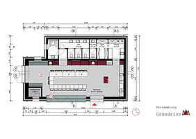 Für die Einbauten wurde Multiplex mit einer Melaminbeschichtung in dunklem burgunderrot verwendet. Die Drehschiebetüren sind aus einem Lochblech, um bei geschlossener Tür mit innen liegenden LEDs für eine besondere Lichtstimmung zu sorgen und auch die dort verstauten Stühle schemenhaft sichtbar zu machen. Ein Hingucker sind die Rückwände, die mit Rollrasen verkleidet sind.