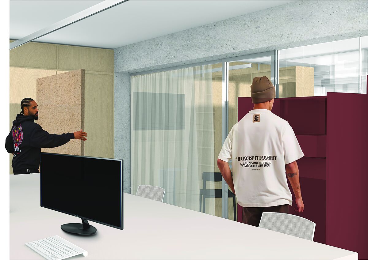 Teil des Entwurfs ist außerdem ein agiles Möbel- und Paneel-System aus einem Edelstahlmöbel in Kombination mit Myzel- und Whiteboard-Paneelen, sowie linoleumgedeckten Tischplatten.