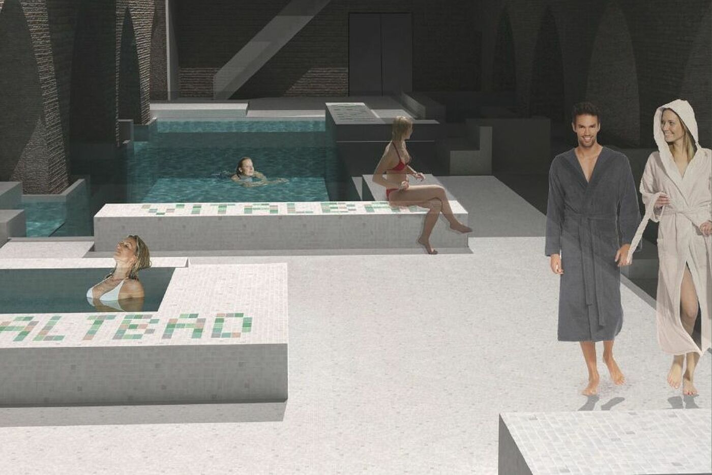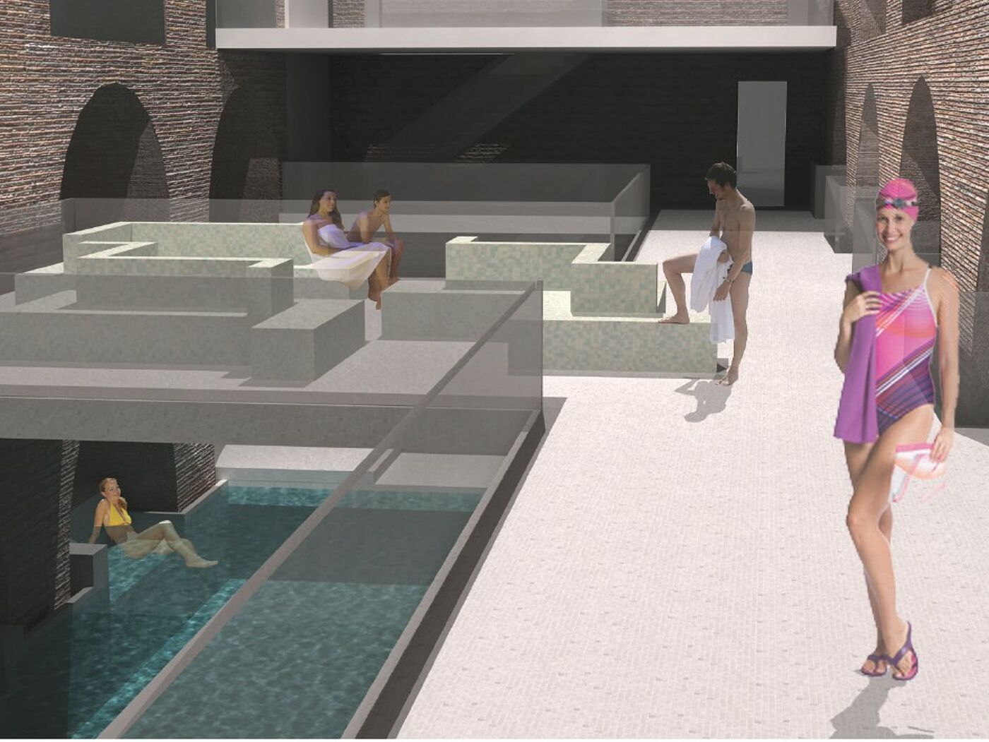 Ziel des Entwurfs war es, die vorhandene Struktur so weit wie möglich beizubehalten und diese zu unterstreichen. Dafür werden die vorhandenen Nischen Teil der Badelandschaft. Durch L-förmige Sitz- und Liegeelemente werden die weiteren Becken zoniert und dadurch definiert. Es entsteht so eine Topografie von Wasser- und Liegeelementen. So ergeben sich unterschiedlich große Aufenthaltsflächen. Die versetzten Galerien bilden mehrere Lufträume, wodurch sich im Spa-Bereich ein spannendes Licht- und Schattenspiel bildet. Die neuen Bauteile wirken wie ein Implantat im Bestand, dass die vorhandenen Mauern respektiert und sich von ihnen abhebt.